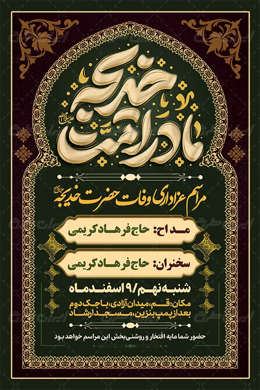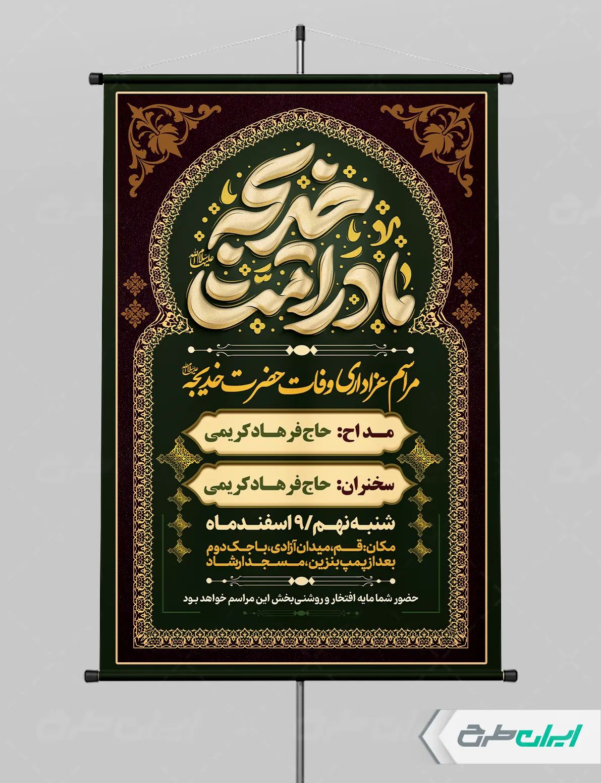 بنر وفات حضرت خدیجه (س)، توسط تیم حرفه ای ایران طرح جهت استفاده کاربران سایت طراحی و به صورت لایه باز در دسترس کاربران قرار گرفته است.