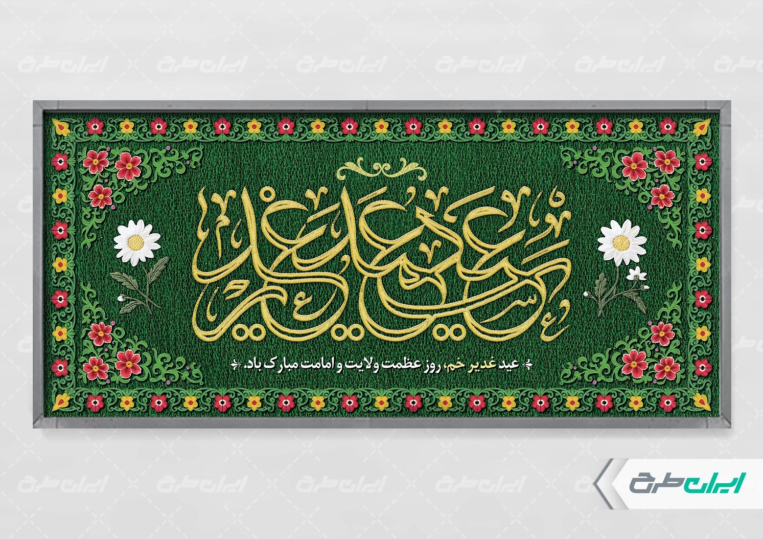 تذهیب، طرح گل و متن تبریک عید غدیر خم می باشد که توسط طراحان ایران طرح در نرم افزار فتوشاپ طراحی شده است.