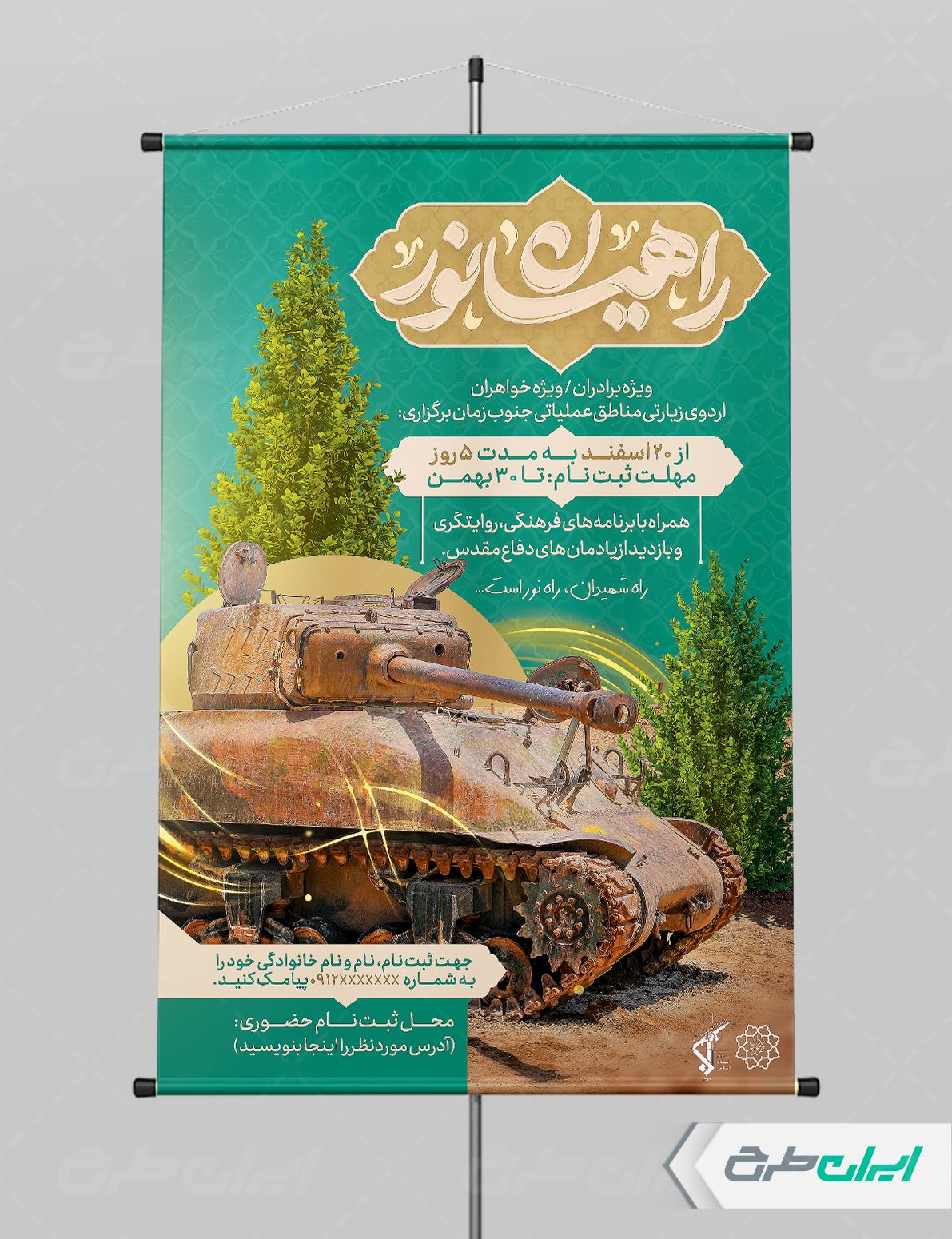 تایپوگرافی راهیان نور، تصویر تانک و متن مرتبط با اطلاع رسانی اردو کاروان راهیان نور می باشد که توسط تیم ایران طرح طراحی شده است.