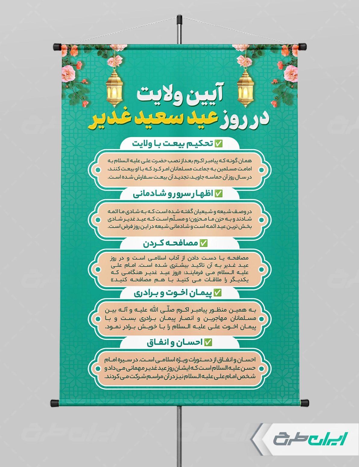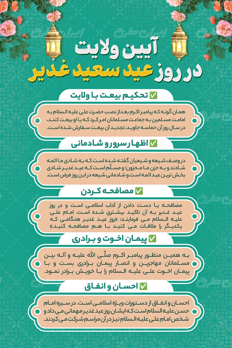 اداب و اعمال عید غدیر و متن تبریک عید غدیر خم می باشد که توسط طراحان ایران طرح در نرم افزار فتوشاپ طراحی شده است.