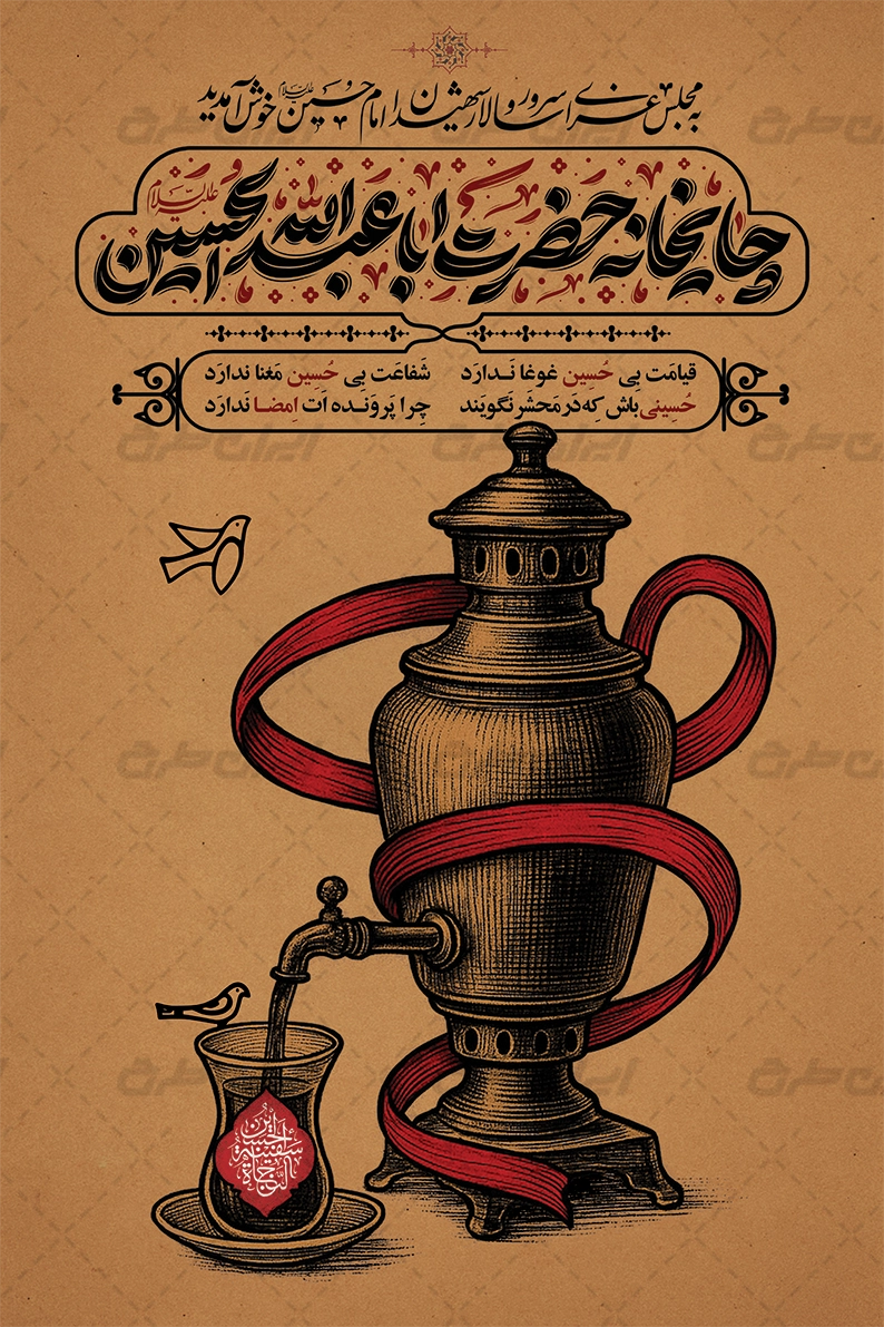 تصویر چای، کادر مذهبی، تایپوگرافی چایخانه حضرت اباعبدالله الحسین در زمینه بنر می باشد که توسط طراحان ایران طرح در نرم افزار فتوشاپ طراحی شده است.