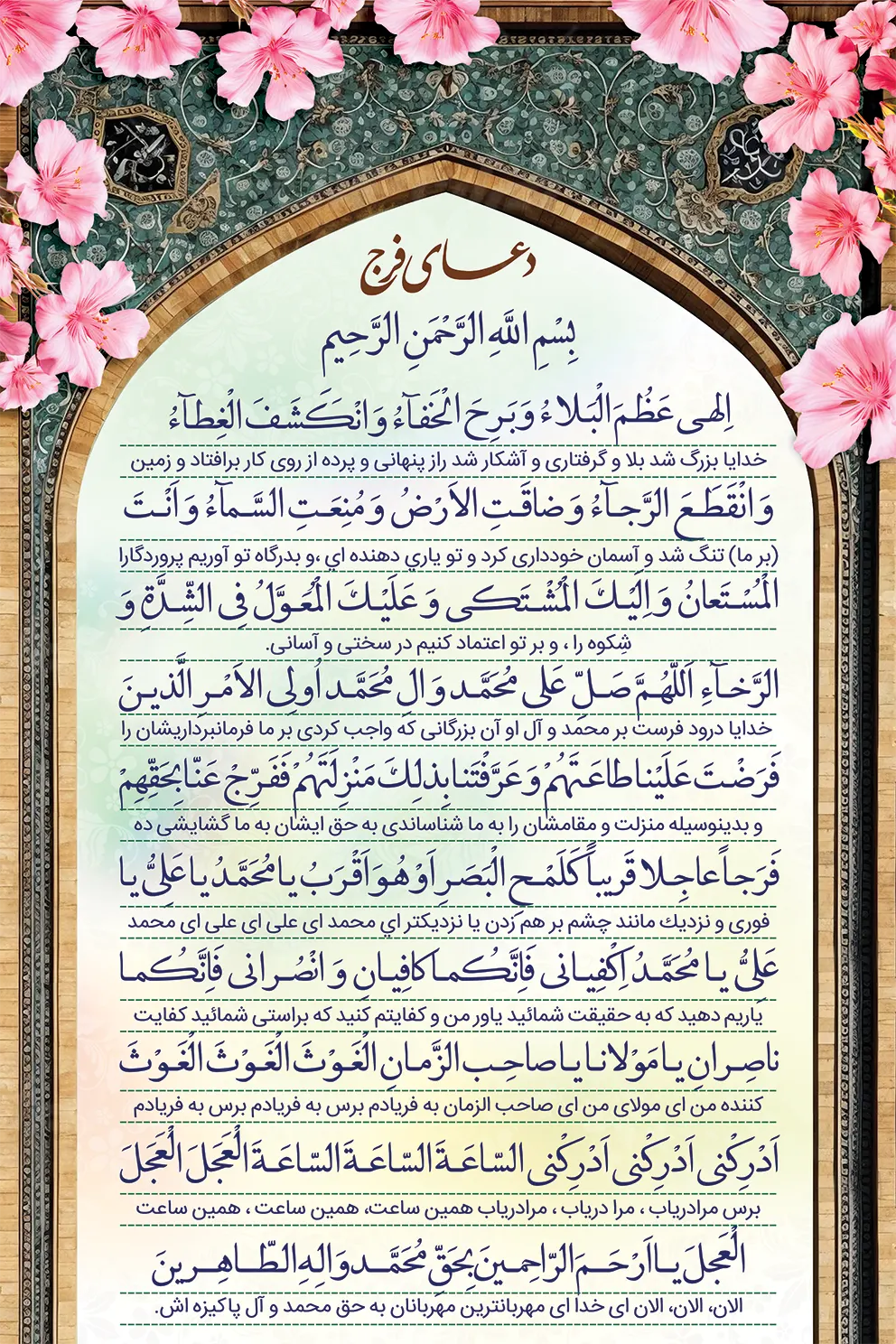 دعای فرج، با عبارت معروف «اللّهُمَّ عَجِّل لِوَلِیِّکَ الفَرَج»، یکی از دعاهای ارزشمند و پرمفهوم در فرهنگ شیعی است که بیانگر اشتیاق قلبی مؤمنان به ظهور امام زمان (عج) و برقراری عدالت جهانی است. این دعا، علاوه بر بُعد معنوی، نماد امید، انتظار فعال و پیوند عاطفی شیعیان با امام عصر (عج) به شمار میرود. خواندن دعای فرج، تجدید عهد با امام غایب و تقویت روحیه صبر، پایداری و ایمان در جامعه است.