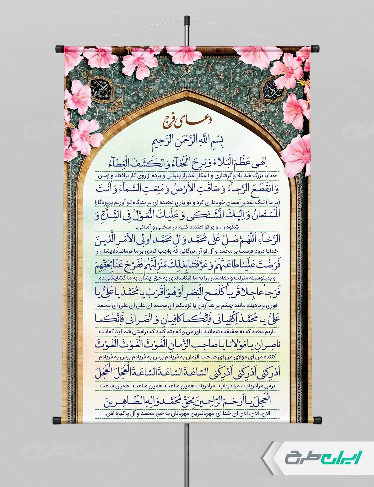 طرح بنر دعای فرج شامل: متن دعای فرج ، طرح گل ، تذهیب ، نقوش مذهبی می باشد که توسط تیم ایران طرح طراحی شده است.