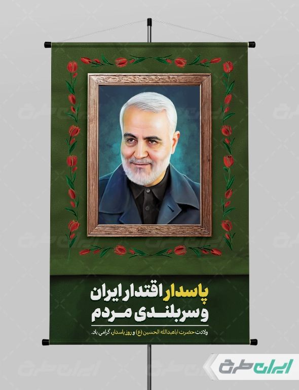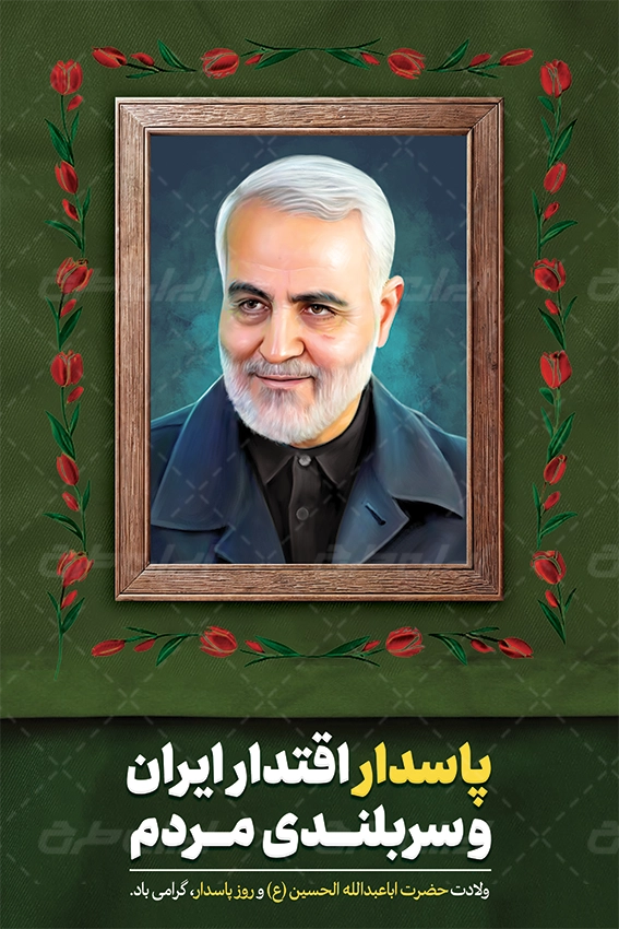تصویر شهید سردار قاسم سلیمانی و پرچم ایران و متن گرامیداشت روز پاسدار می باشد که توسط تیم ایران طرح طراحی شده است.