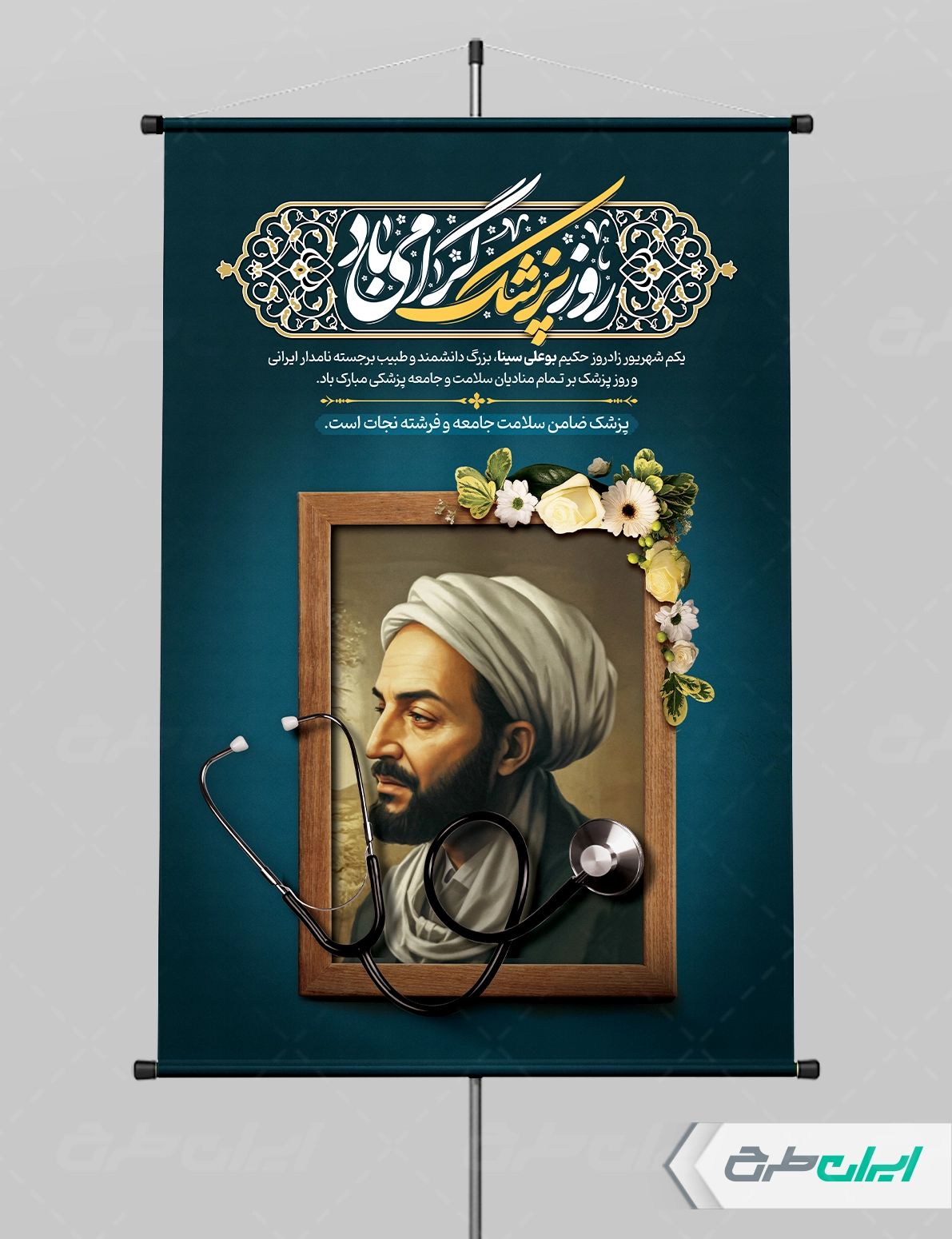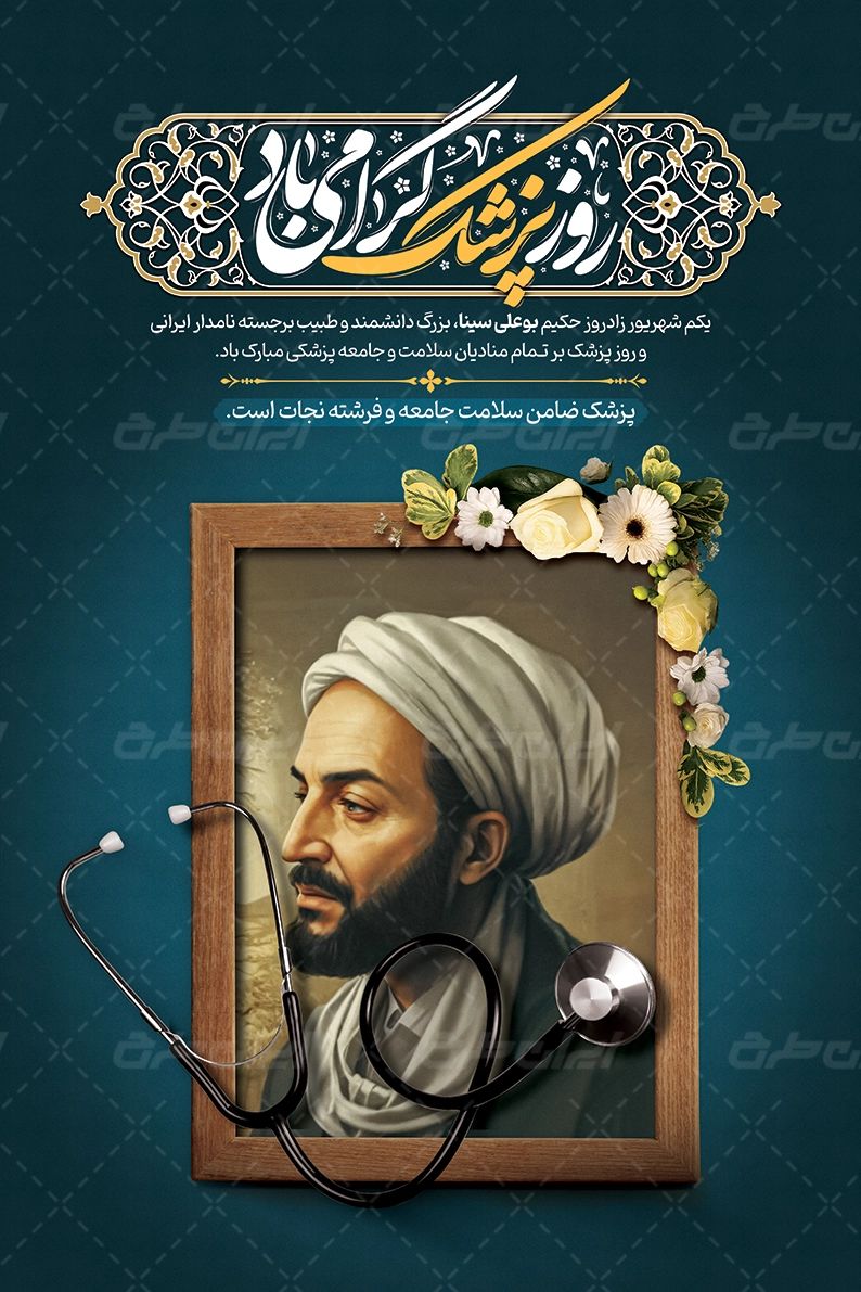 تصویر بو علی سینا و متن گرامیداشت روز پزشک میباشد که توسط طراحان ایران طرح در نرم افزار فتوشاپ طراحی شده است.