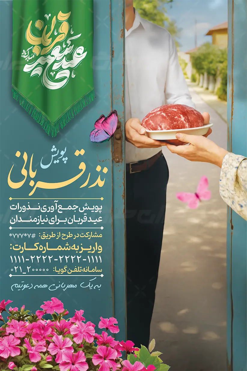 تصویر نذری دادن و متن تبریک عید قربان می باشد که توسط طراحان ایران طرح در نرم افزار فتوشاپ طراحی شده است.