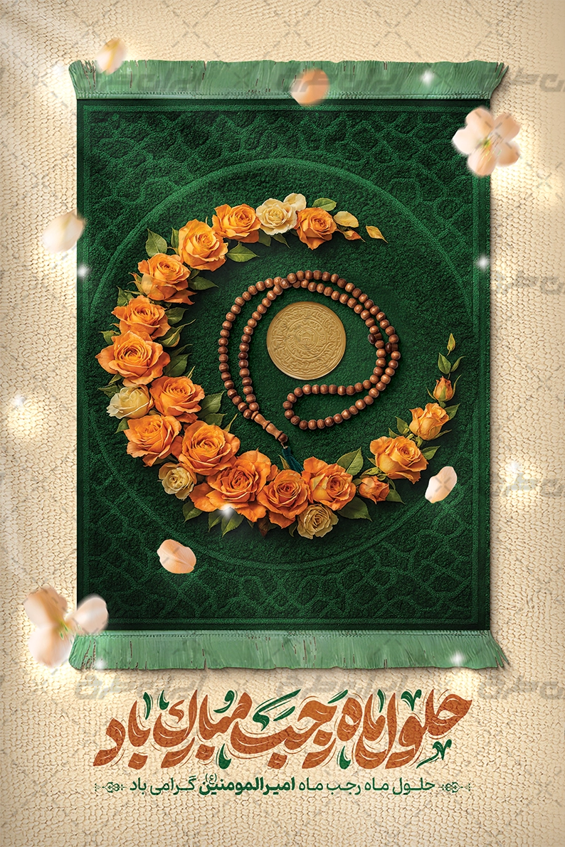 تایپوگرافی حلول ماه رجب مبارک باد، تصویر مهر و تسبیح، تذهیب، نقوش مذهبی و متن گرامیداشت ماه رجب می باشد که توسط تیم ایران طرح طراحی شده است.