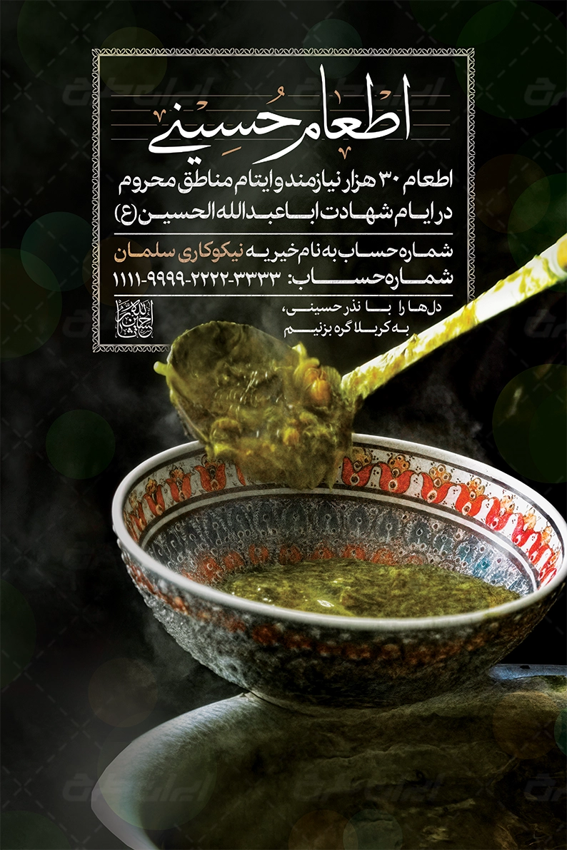 تایپوگرافی اطعام حسینی و متن تسلیت ایام محرم می باشد که توسط طراحان ایران طرح در نرم افزار فتوشاپ طراحی شده است.