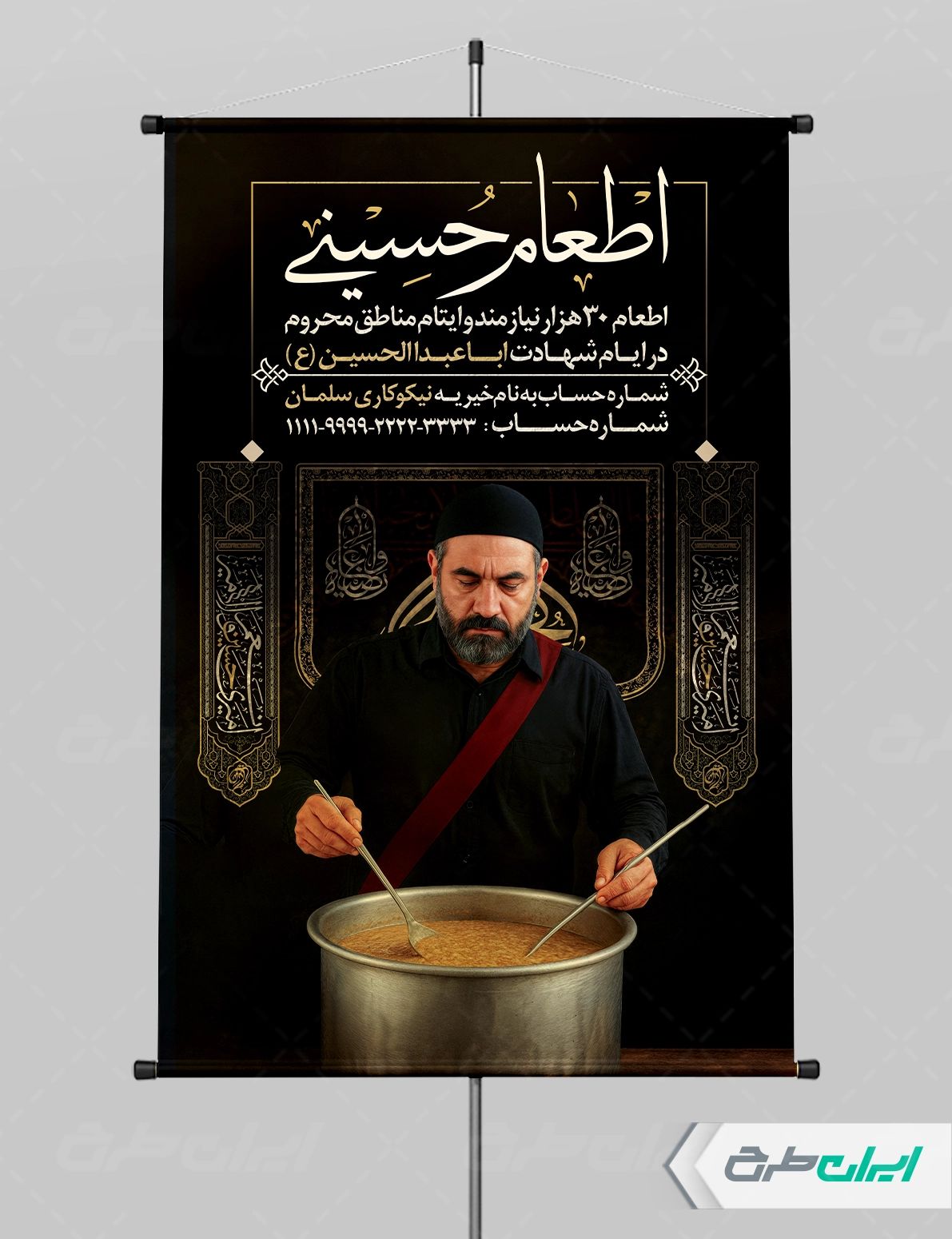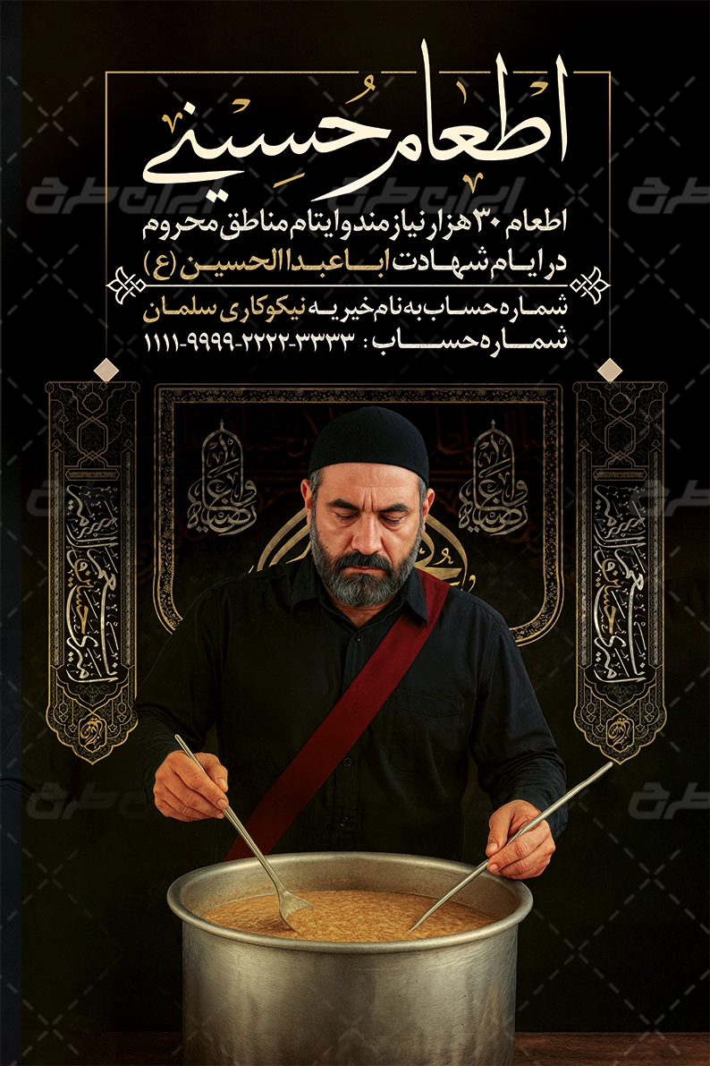تصویر عزادار حسینی و دیگ نذری و متن تسلیت ایام محرم می باشد که توسط طراحان ایران طرح در نرم افزار فتوشاپ طراحی شده است.