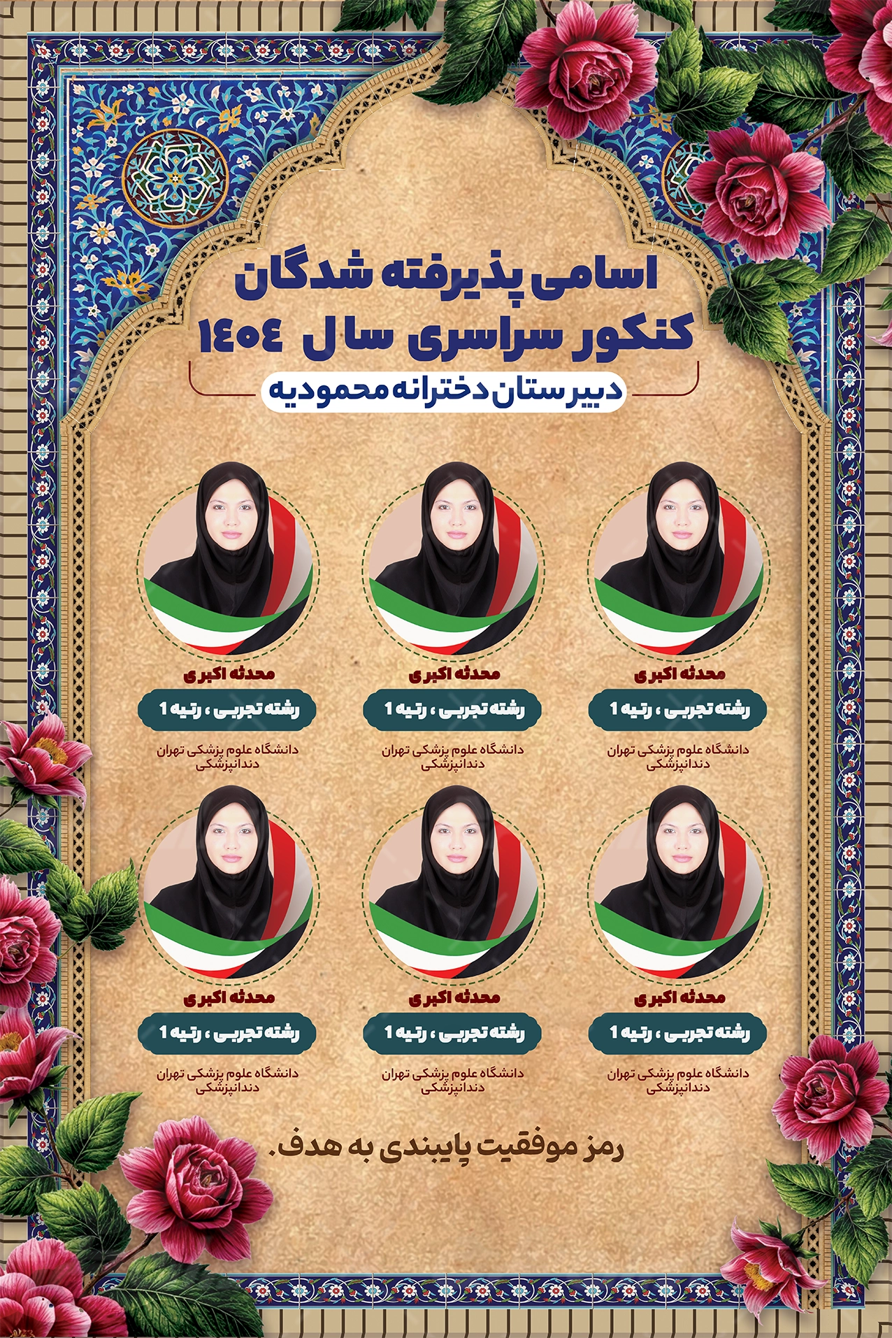 آیکون استفاده از تصویر فرد، طرح گل، تذهیب، زمینه کرم و متن تبریک و موفقیت می باشد که توسط طراحان ایران طرح در نرم افزار فتوشاپ طراحی شده است.