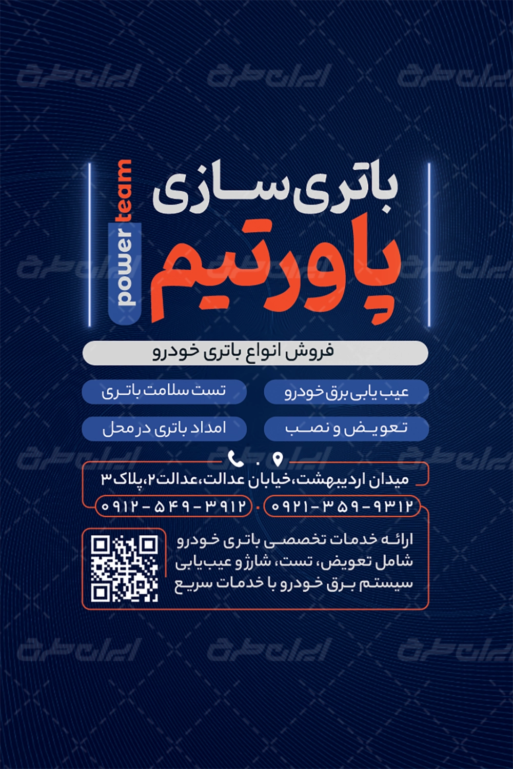 کارت ویزیت باطری سازی، توسط طراحان ایران طرح جهت بازاریابی فروشگاه ها و یا تبلیغات در سطح شهر توسط کاسبان این شغل طراحی و در دسترس کابران سایت قرار گرفته است.