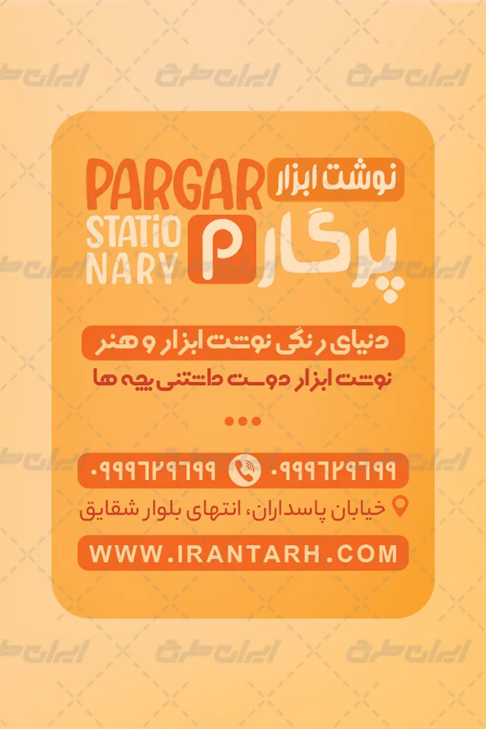 طرح کارت ویزیت فروشگاه لوازم تحریر، توسط تیم ایران طرح جهت تبلیغات و بازاریابی این دسته از فروشگاه ها طراحی شده است.