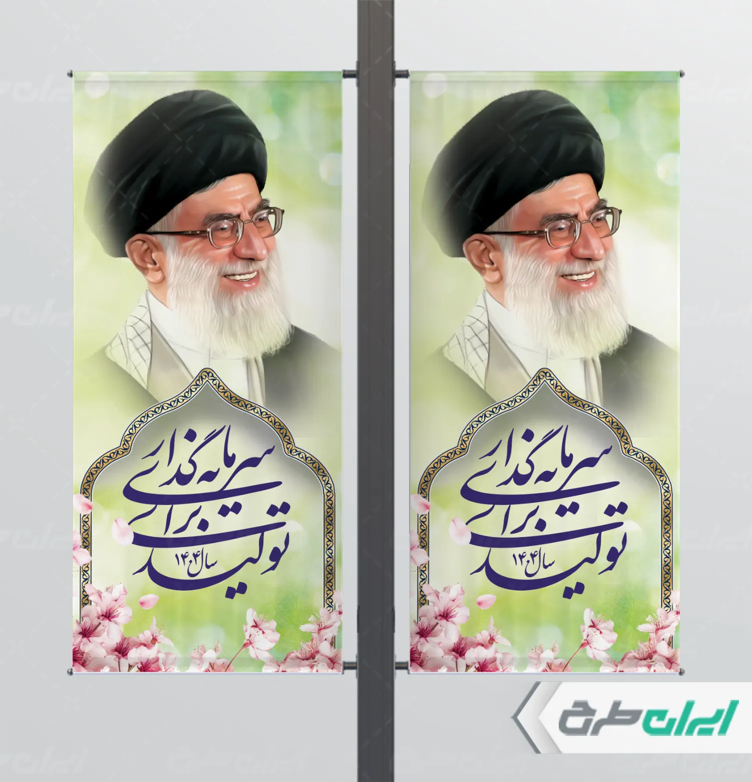 تصویر رهبری و متن شعار سال سرمایه گذاری برای تولید، که توسط تیم ایران طرح طراحی شده است.