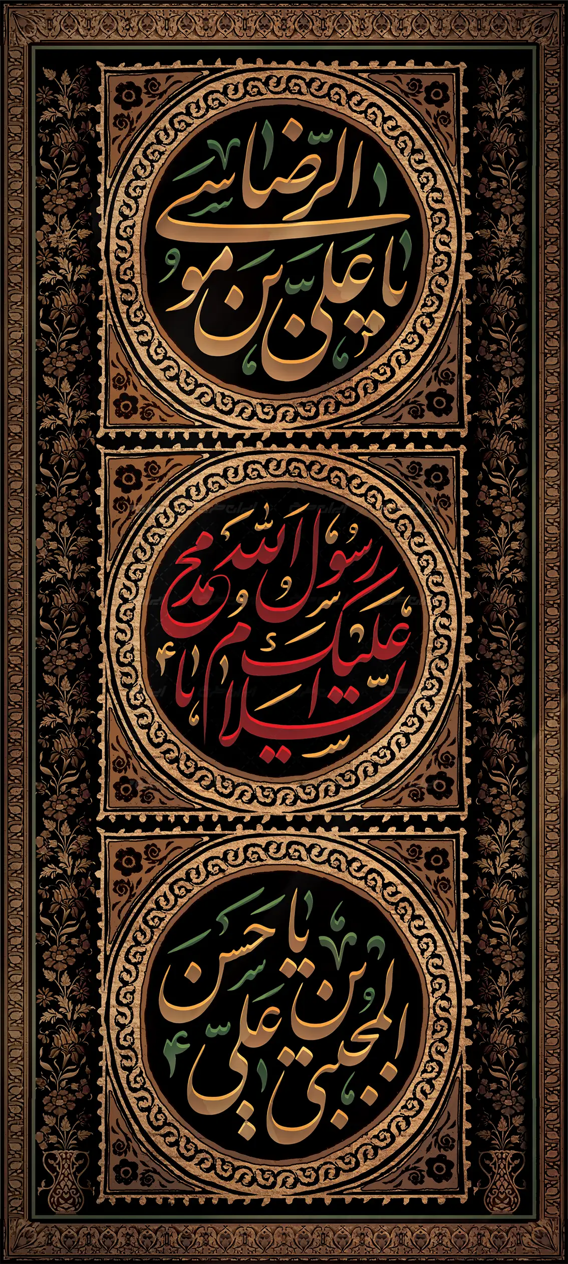 تذهیب، نقوش مذهبی و متن تسلیت رحلت پیامبر و شهادت امام حسن و امام رضا (ع) می باشد که توسط تیم ایران طرح طراحی شده است.