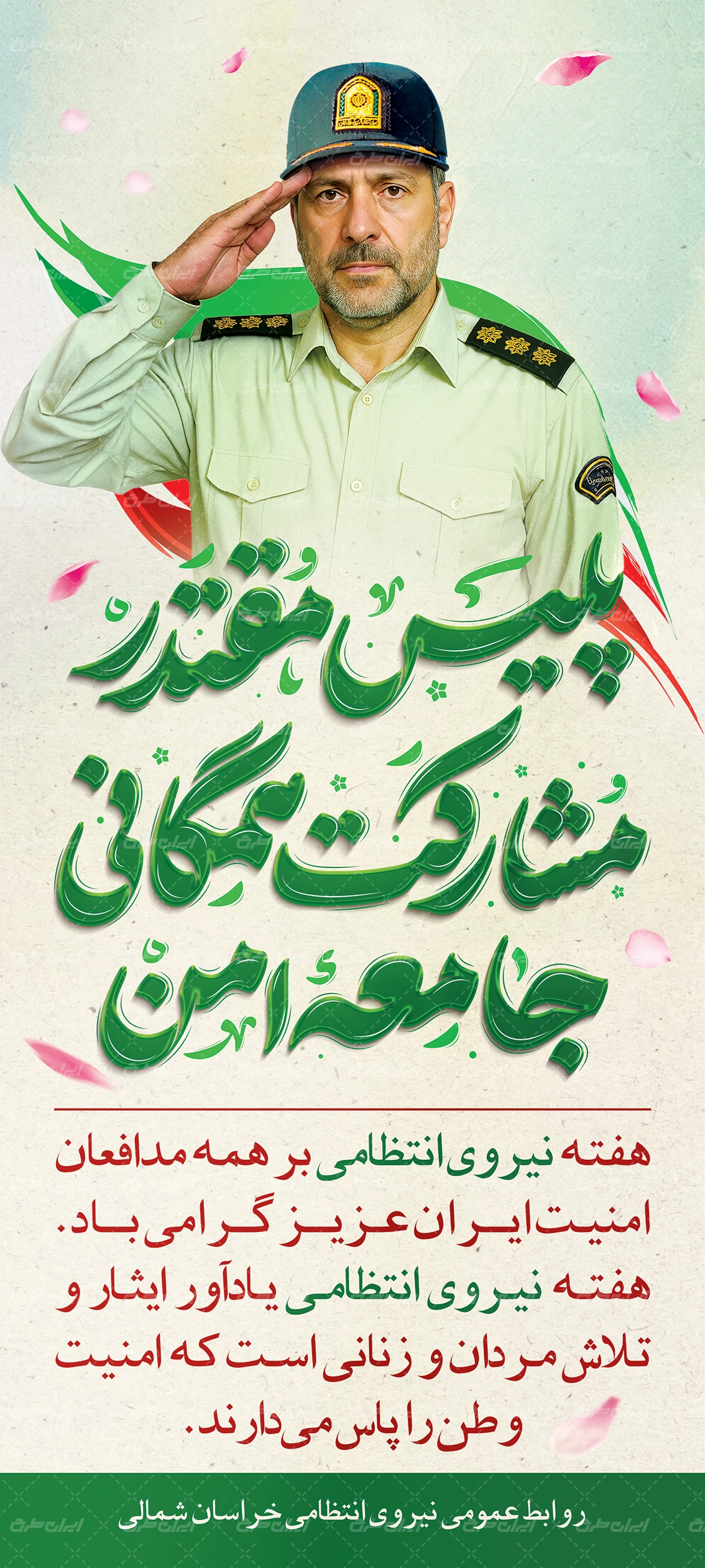 تایپوگرافی هفته نیروی انتظامی، آرم و لوگوی نیروی انتظامی، عکس باکیفیت نیرو انتظامی، گل، کادر مذهبی، پرچم ایران و متن تبریک هفته نیروی انتظامی می باشد که توسط تیم ایران طرح طراحی شده است.