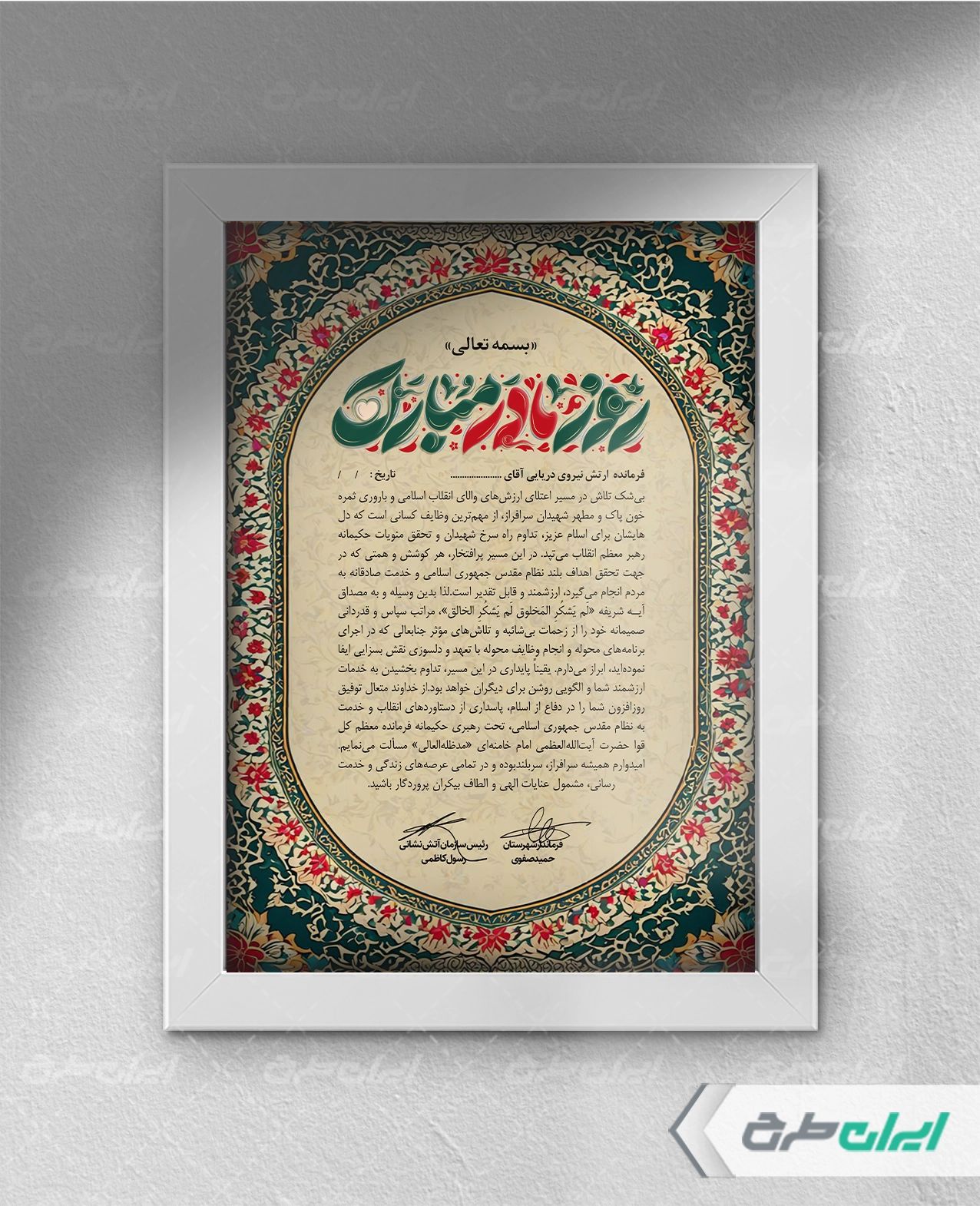 تایپوگرافی، کادر مذهبی، تذهیب، حاشیه تذهیب، گل، جلوه نور و متن تقدیر و تشکر می باشد که توسط طراحان ایران طرح در نرم افزار فتوشاپ طراحی شده است.