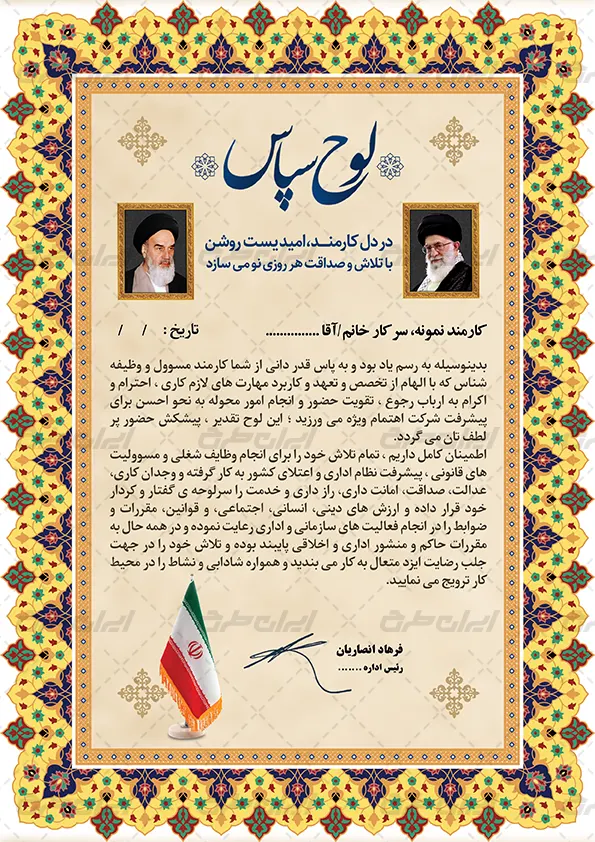 تصویرپرچم ایران، تایپوگرافی ، کادر مذهبی، تذهیب، حاشیه تذهیب، گل، جلوه نور و متن تقدیر و تشکر می باشد که توسط طراحان ایران طرح در نرم افزار فتوشاپ طراحی شده است. به دلیل لایه باز (قابل ویرایش توسط کاربران در نرم افزار فتوشاپ Adobe Photoshop) بودن و کیفیت بالای عناصر و المان های استفاده شده در طرح، می توانید علاوه بر چاپ لوح تقدیر(به صورت عمودی)، در استوری اینستاگرام و سایر پلت فرم های فضای مجازی نیز استفاده نمایید.