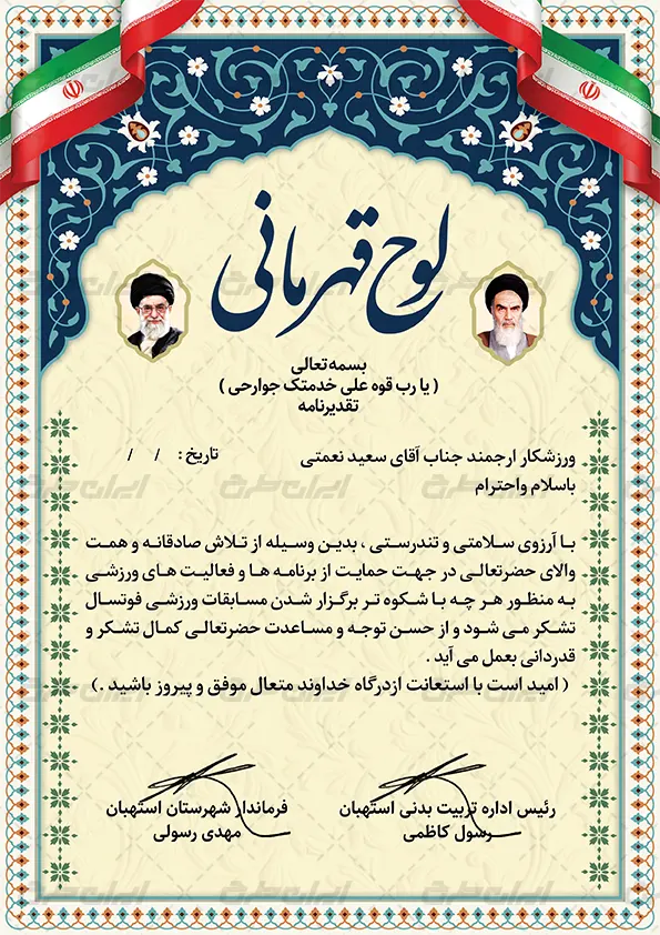 طرح لوح تقدیر قهرمانی، توسط تیم ایران طرح جهت تقدیر و تشکر از ورزشکاران طراحی و در دسترس کاربران سایت قرار گرفته است.