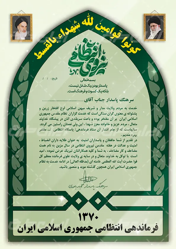 لوگوی نیروی انتظامی، تایپوگرافی، کادر مذهبی، تذهیب، حاشیه تذهیب، گل، جلوه نور و متن تقدیر و تشکر می باشد که توسط طراحان ایران طرح در نرم افزار فتوشاپ طراحی شده است.