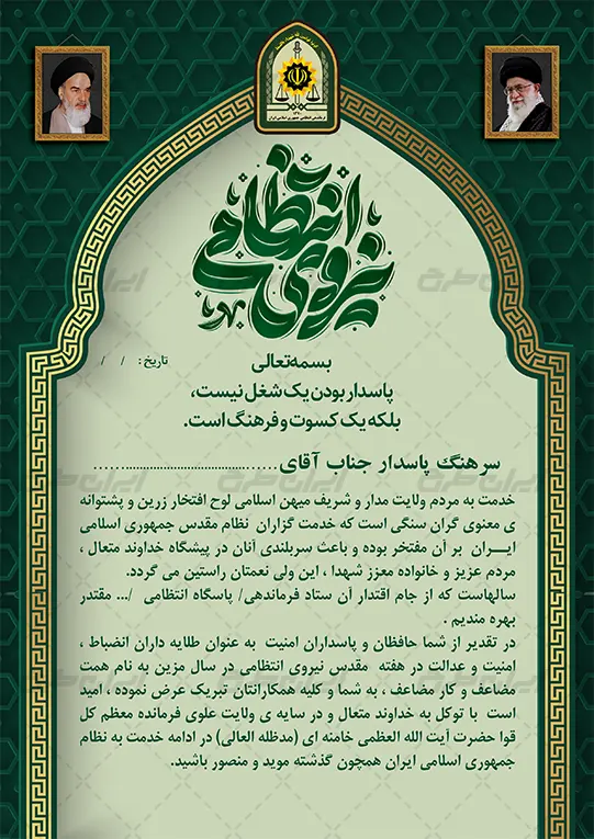 لوگوی نیروی انتظامی، تایپوگرافی، کادر مذهبی، تذهیب، حاشیه تذهیب، گل، جلوه نور و متن تقدیر و تشکر می باشد که توسط طراحان ایران طرح در نرم افزار فتوشاپ طراحی شده است.