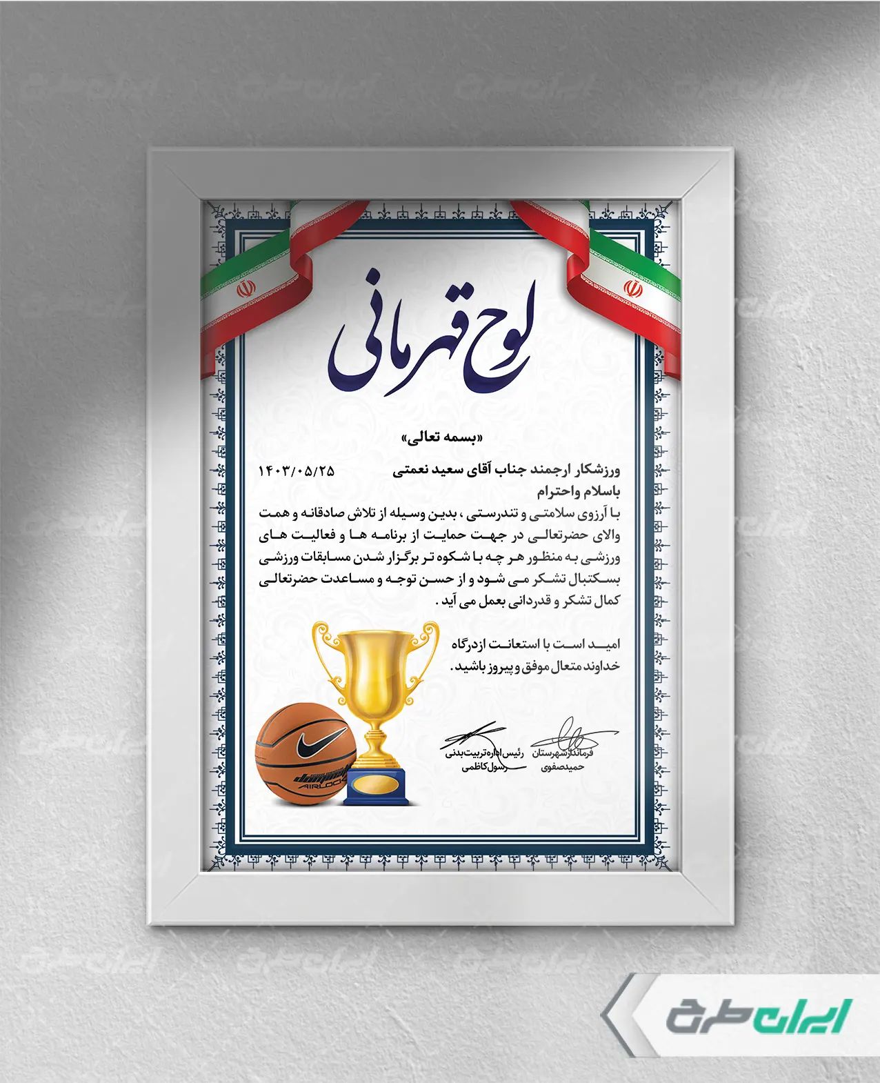 طرح لوح تقدیر قهرمانی، توسط تیم ایران طرح جهت تقدیر و تشکر از ورزشکاران طراحی و در دسترس کاربران سایت قرار گرفته است.