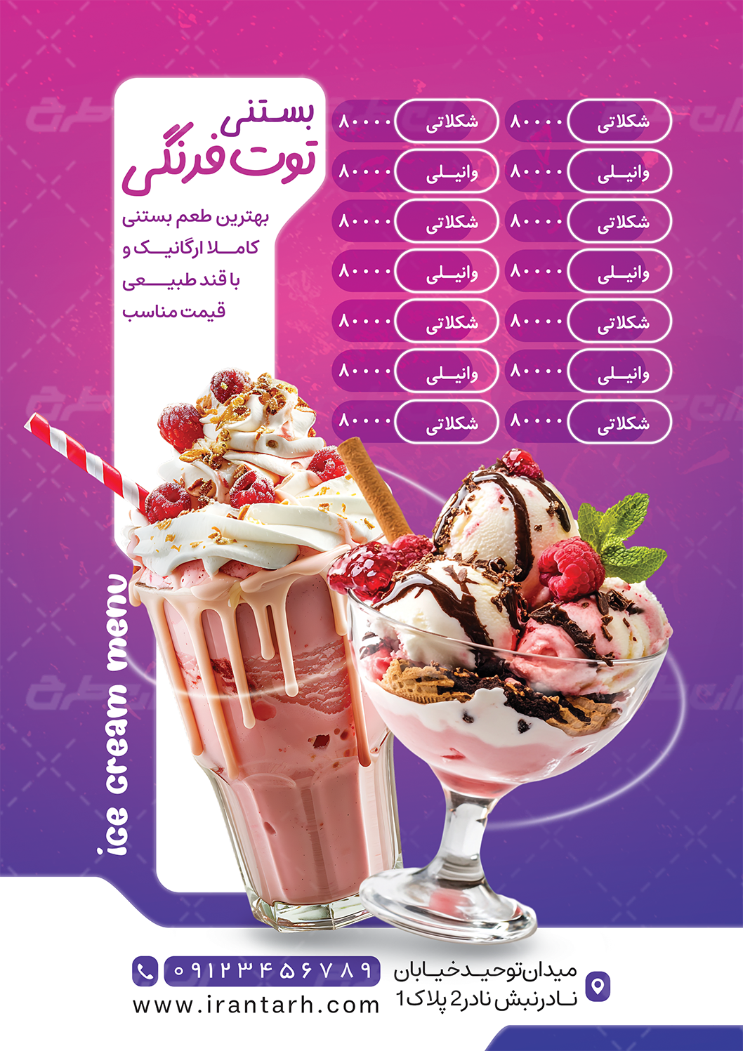 طرح لایه باز منوی بستنی فروشی ابزاری حرفهای و انعطافپذیر برای طراحی و تبلیغ محصولات متنوع بستنی است. این طرحها به طراحان و صاحبان بستنی فروشی امکان میدهند تا منویی زیبا و جذاب با قابلیت ویرایش سریع و آسان ایجاد کنند. با استفاده از طرحهای لایه باز، میتوان به راحتی تصاویر، قیمتها و توضیحات را متناسب با نیاز فروشگاه تغییر داد و منویی بهروز و متناسب با فصل یا مناسبتهای خاص طراحی کرد.