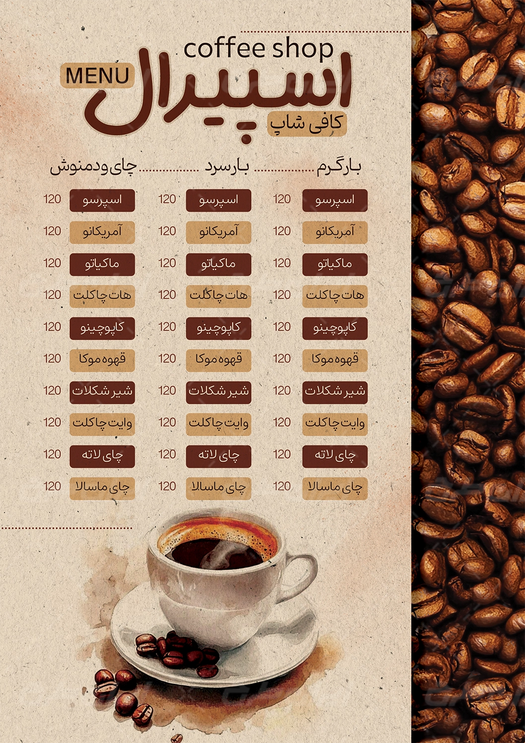 - استفاده مناسب از عکس با کیفیت دانه قهوه و فنجان که مناسب طرح منو کافه قهوه می باشد.