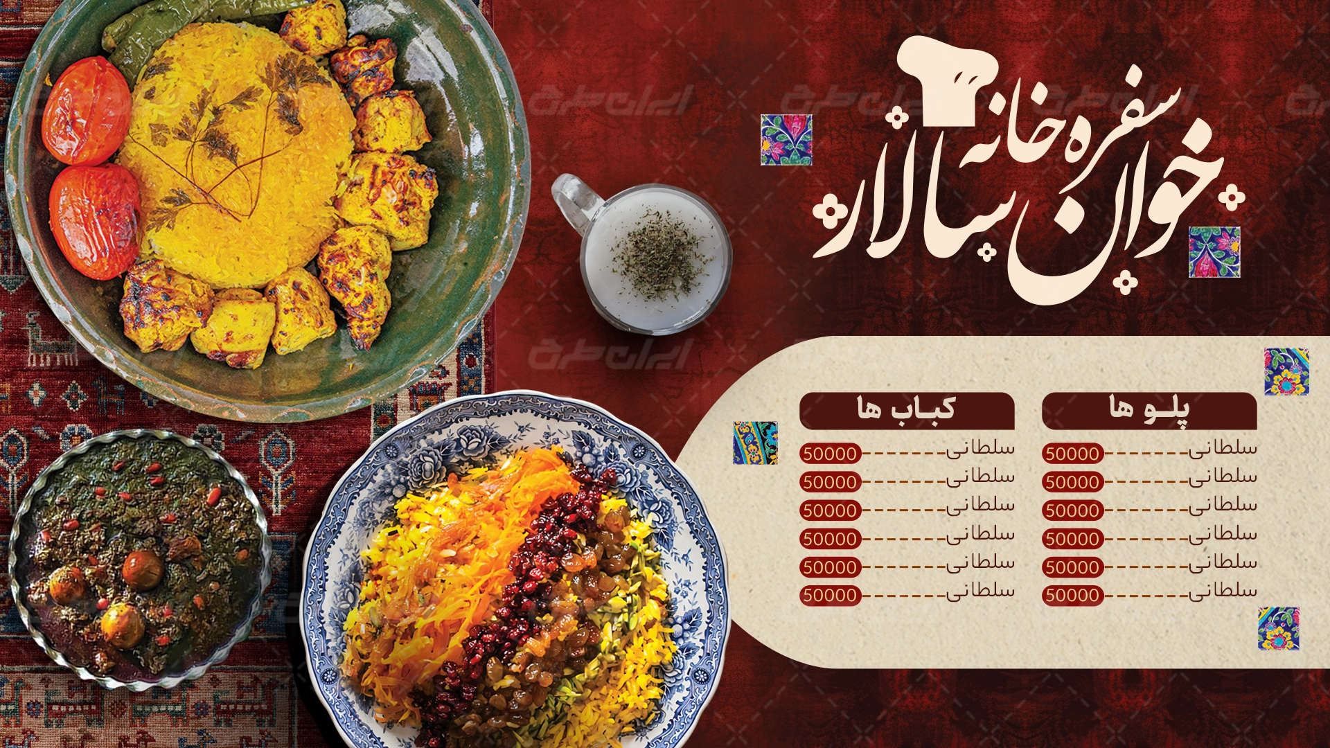 طرح لایه باز نمایشگر سفرهخانه سنتی یکی از ابزارهای مهم در طراحی گرافیکی برای معرفی رستورانها و فضاهای سنتی ایرانی است. این طرحها معمولاً شامل عناصری مانند فرشهای ایرانی، ظروف سفالی، سماور، پشتیهای سنتی، و فضای دلنشین ایرانی میباشند که حس نوستالژی و اصالت را در مخاطب زنده میکنند. استفاده از این عناصر باعث میشود هویت فرهنگی سفرهخانه بهخوبی در ذهن بیننده نقش ببندد.