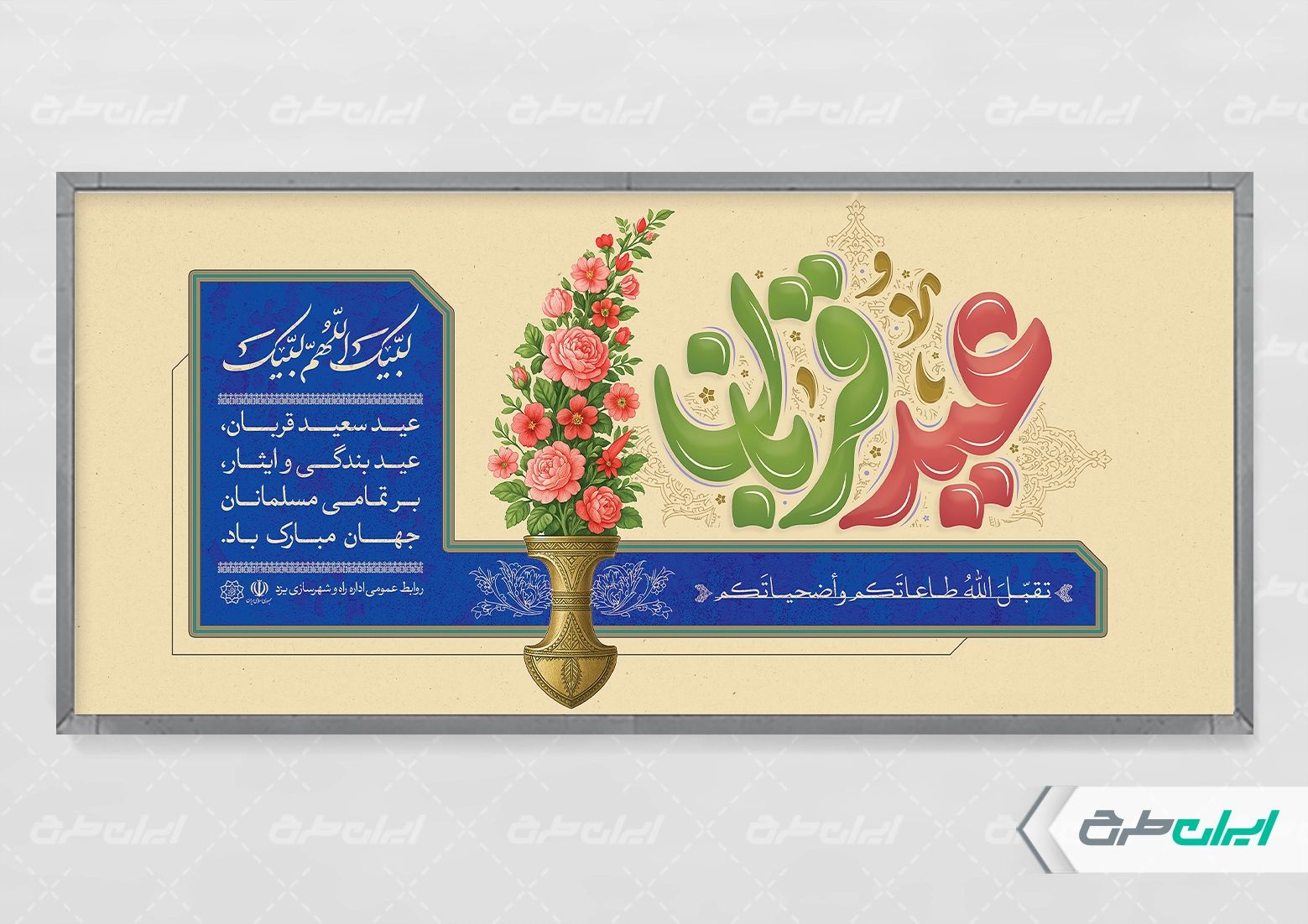 تذهیب و متن تبریک عید قربان می باشد که توسط طراحان ایران طرح در نرم افزار فتوشاپ طراحی شده است.