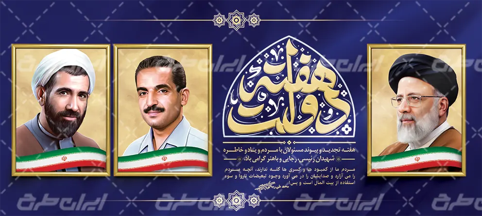 تصویر شهید رجایی و شهید باهنر و شهید رئیسی، تایپوگرافی هفته دولت، تذهیب، کادر اسلیمی، نقوش اسلیمی و متن گرامیداشت هفته دولت میباشد که توسط طراحان ایران طرح در نرم افزار فتوشاپ طراحی شده است.
