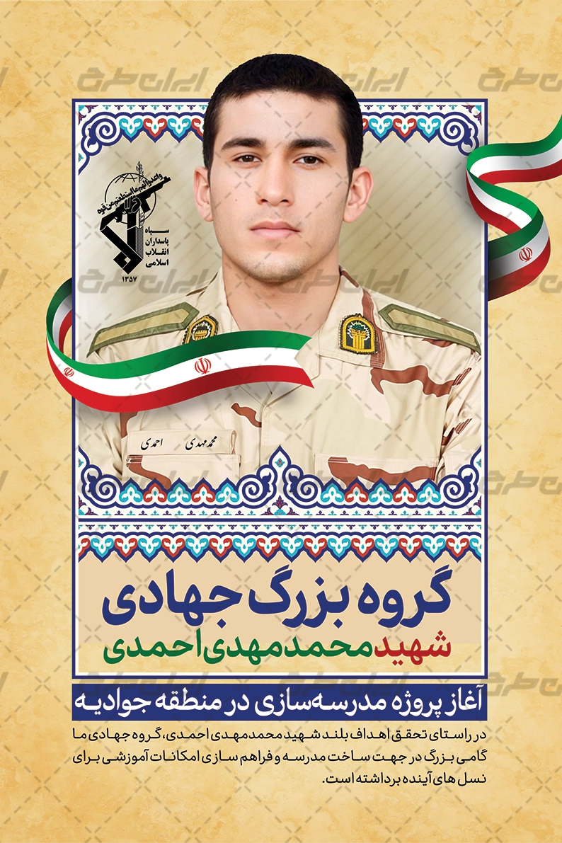 طرح پوستر اردوهای جهادی با تصویر شهید محمد مهدی احمدی