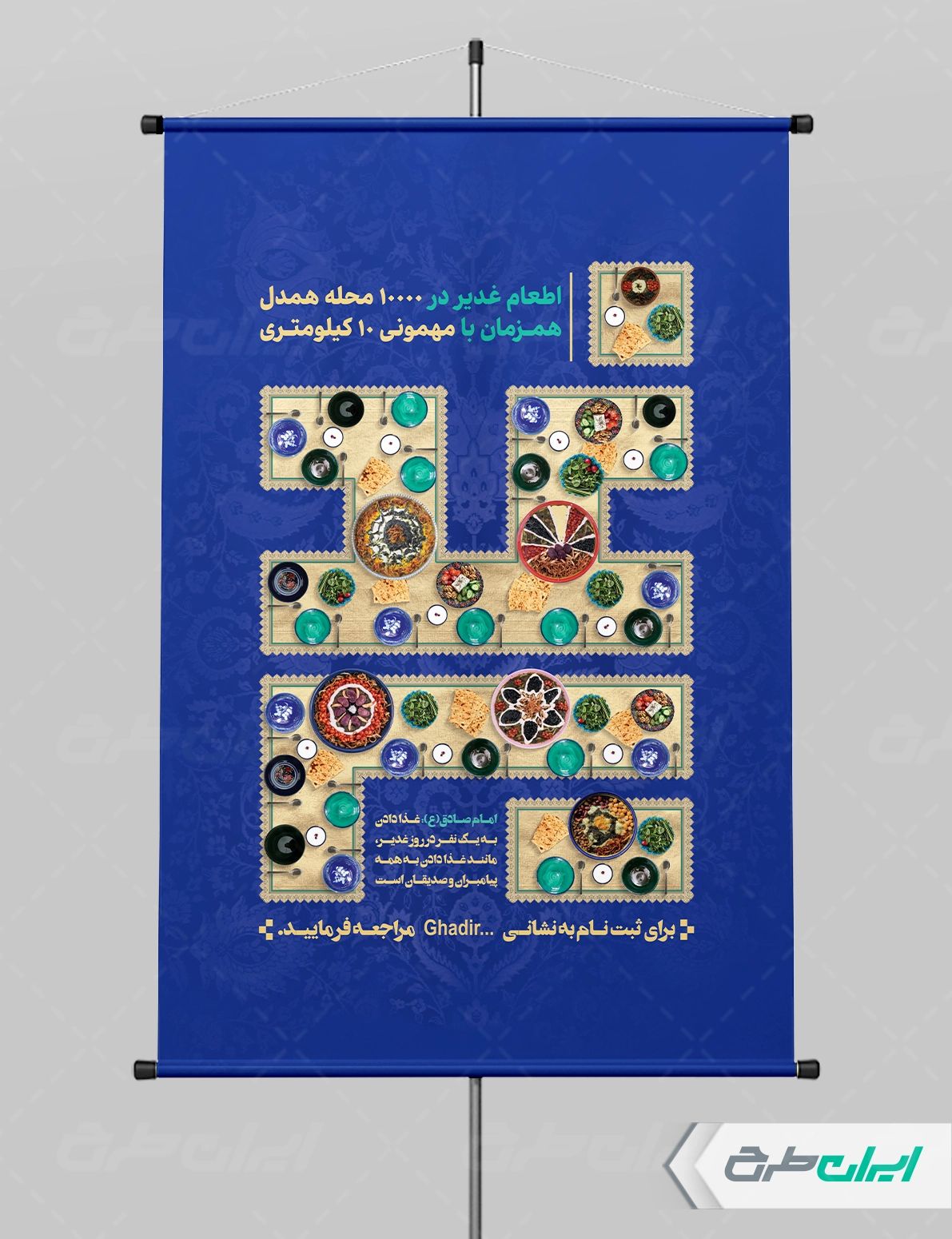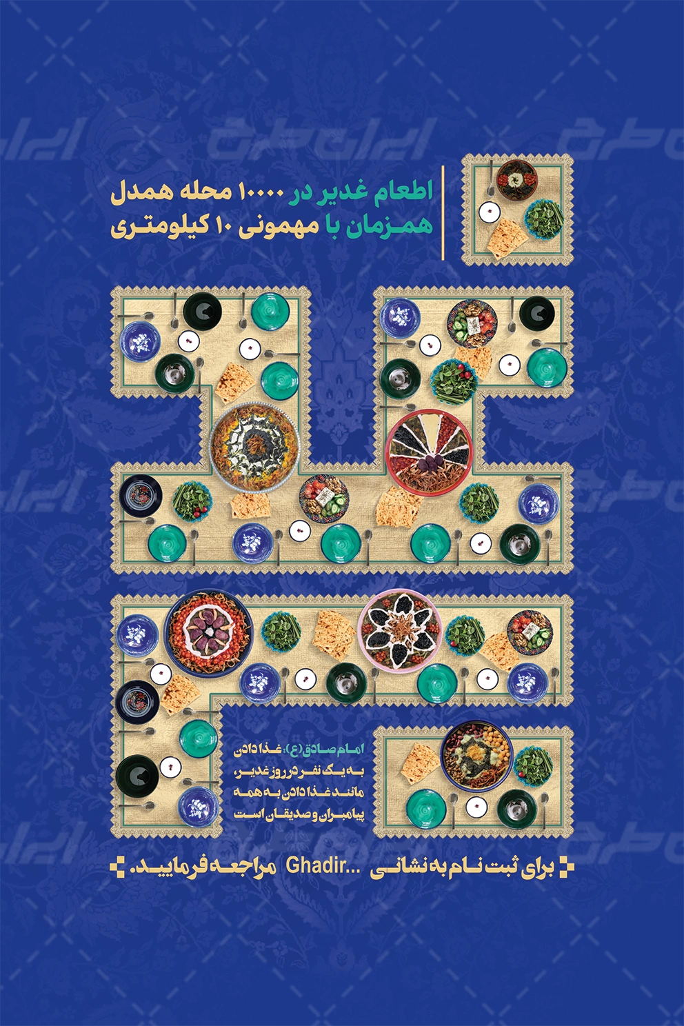 تصویر سفره اطعام ایتام و متن تبریک عید غدیر خم می باشد که توسط طراحان ایران طرح در نرم افزار فتوشاپ طراحی شده است.