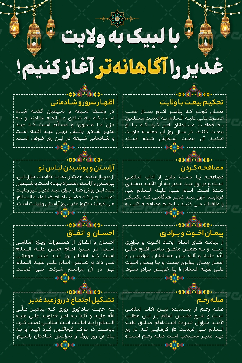 اداب و اعمال عید غدیر و متن تبریک عید غدیر خم می باشد که توسط طراحان ایران طرح در نرم افزار فتوشاپ طراحی شده است.