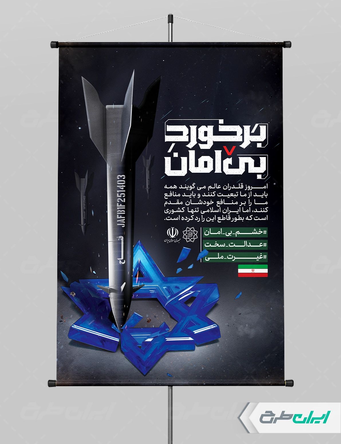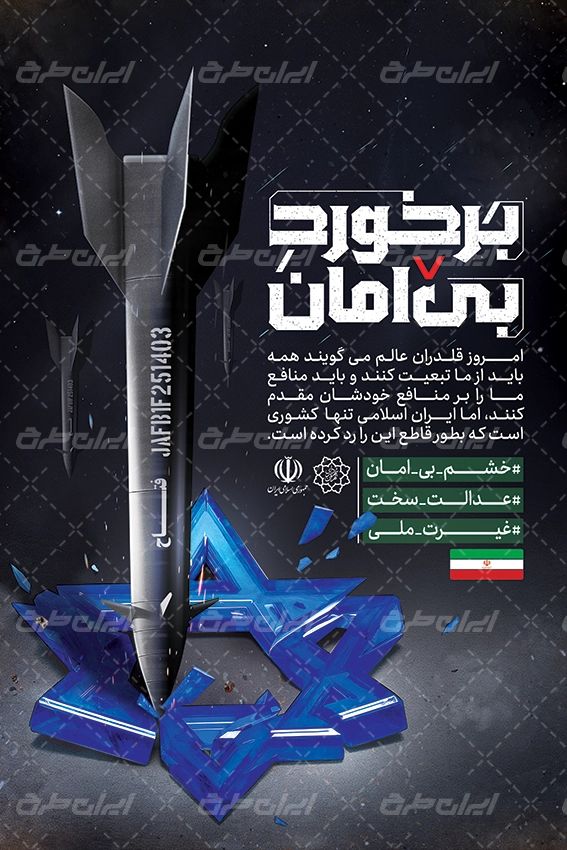 تایپوگرافی برخورد بی امان و متن مرتبط با این حمله موشکی است که توسط تیم خلاق ایران طرح طراحی شده است.