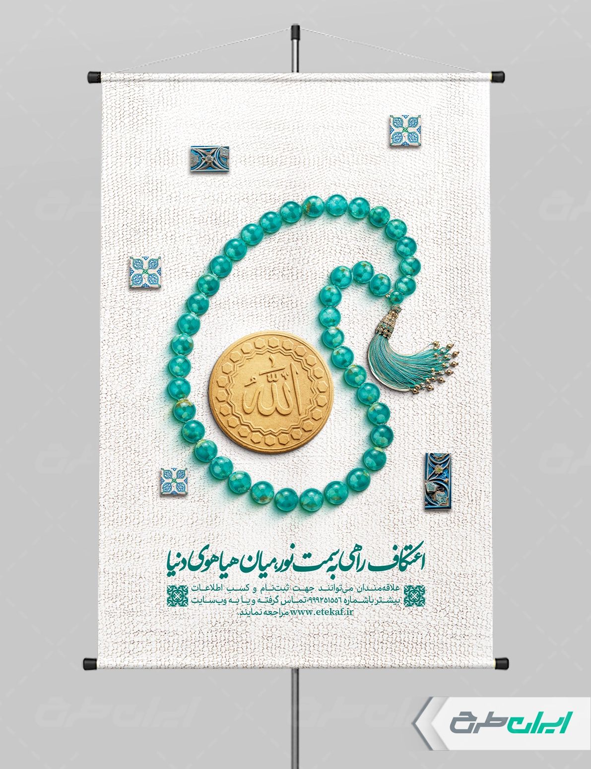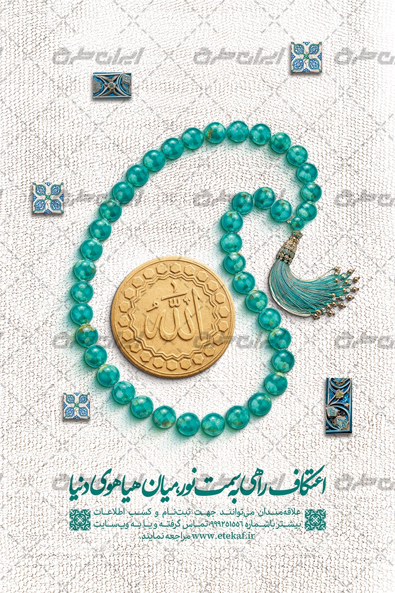 تایپوگرافی اعتکاف، تصویر تسبیح و مهر و متن مرتبط با بنر اطلاع رسانی مراسم اعتکاف می باشد که توسط تیم ایران طرح طراحی شده است.