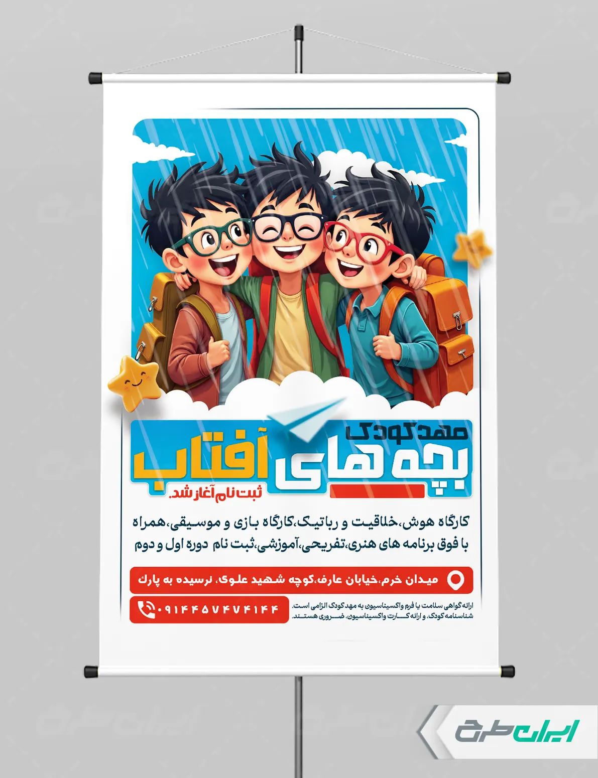 طرح بنر لایه باز مهد کودک و پیش دبستانی، توسط طراحان ایران طرح جهت نصب سردر این آموزشگاه ها، طراحی و در دسترس کاربران سایت قرار گرفته است.