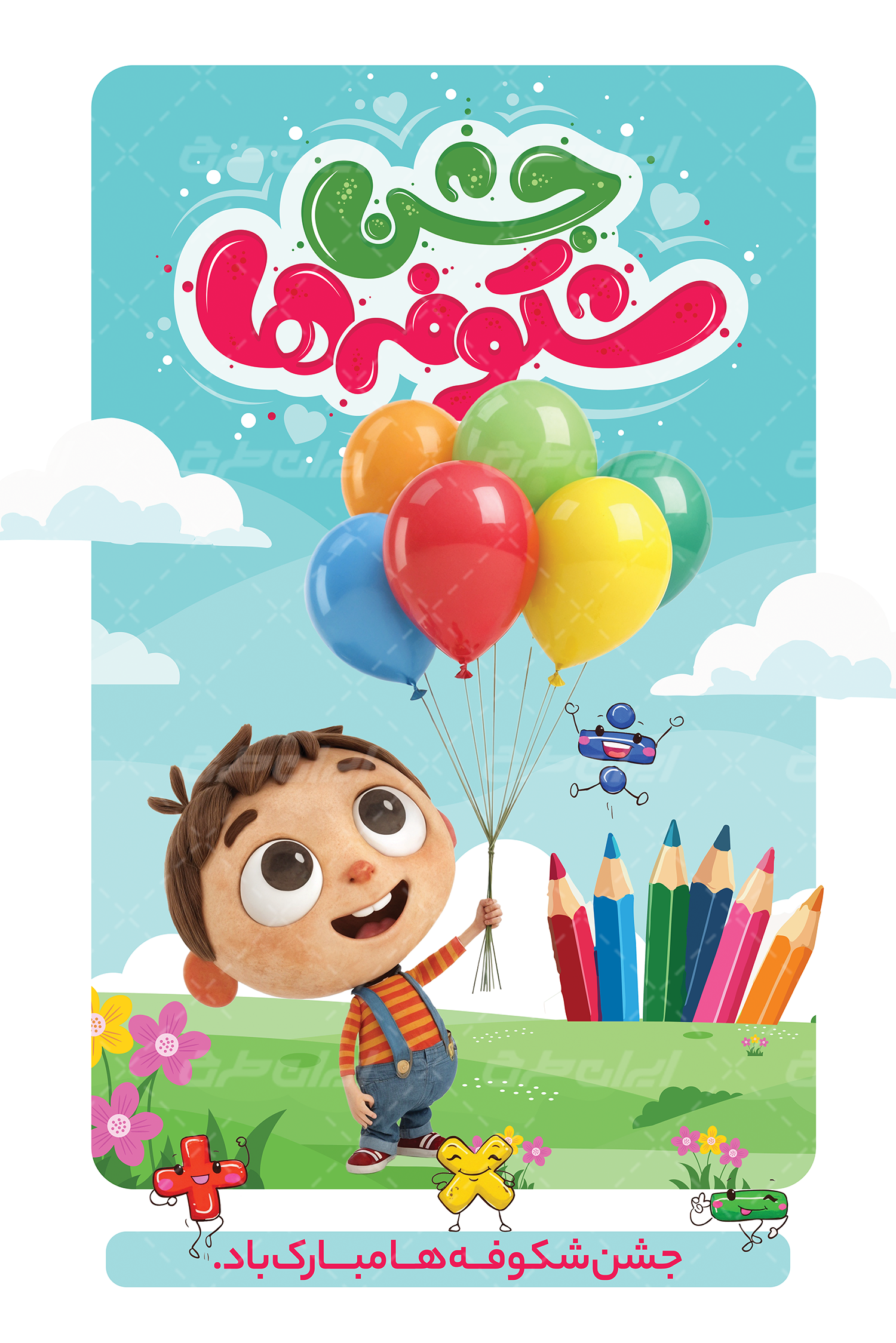 تایپوگرافی جشن شکوفه ها ، وکتور پسر بچه و متن تبریک بازگشایی مدارس توسط تیم ایران طرح در نرم افزار فتوشاپ طراحی شده است.