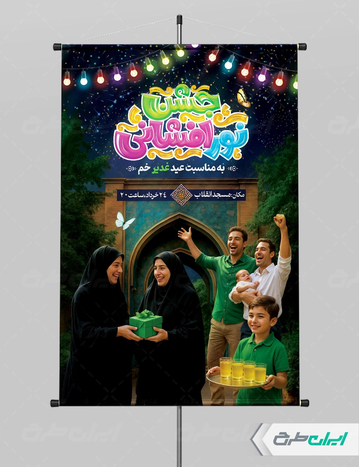 ضمنا به دلیل لایه باز بود طرح بنر عید غدیر می توانید با استفاده از نرم افزار فتوشاپ تغییرات دلخواه خود را اعمال کنید.