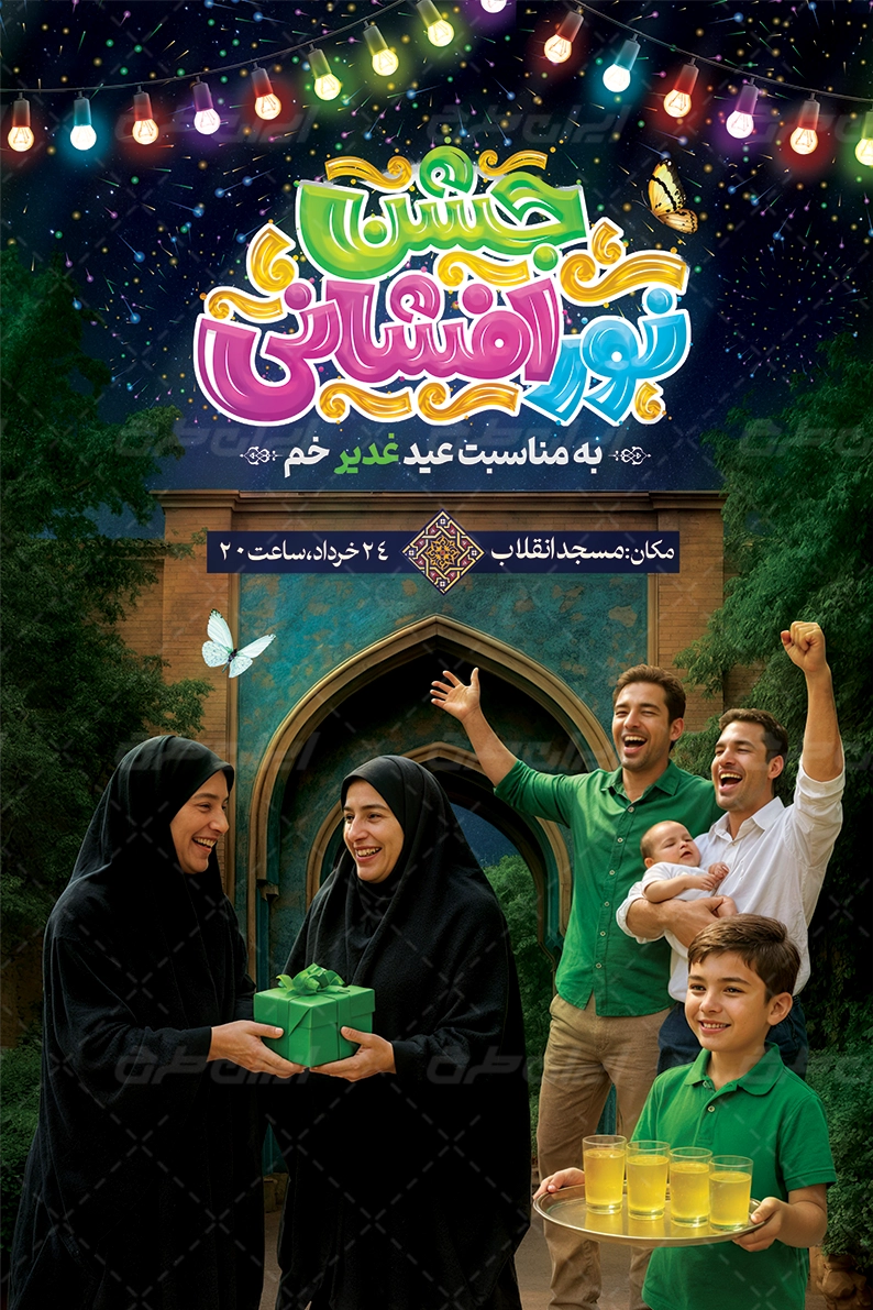 تایپوگرافی جشن نور افشانی و متن تبریک عید غدیر خم می باشد که توسط طراحان ایران طرح در نرم افزار فتوشاپ طراحی شده است.