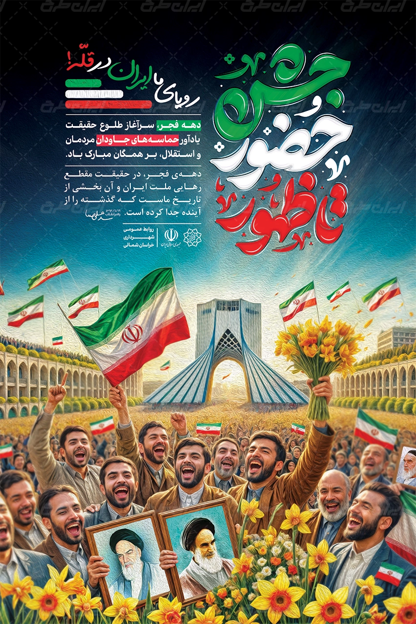 تصویر میدان آزادی، تایپوگرافی جشن حضور تا ظهور و متن گرامیداشت دهه فجر می باشد که توسط تیم ایران طرح طراحی شده است.