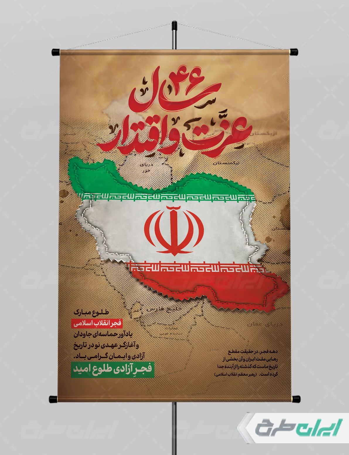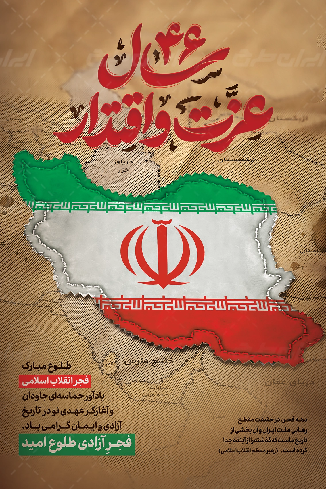 تصویر پرچم ایران، تایپوگرافی 46 سال عزت و افتخار و متن گرامیداشت دهه فجر می باشد که توسط تیم ایران طرح طراحی شده است.