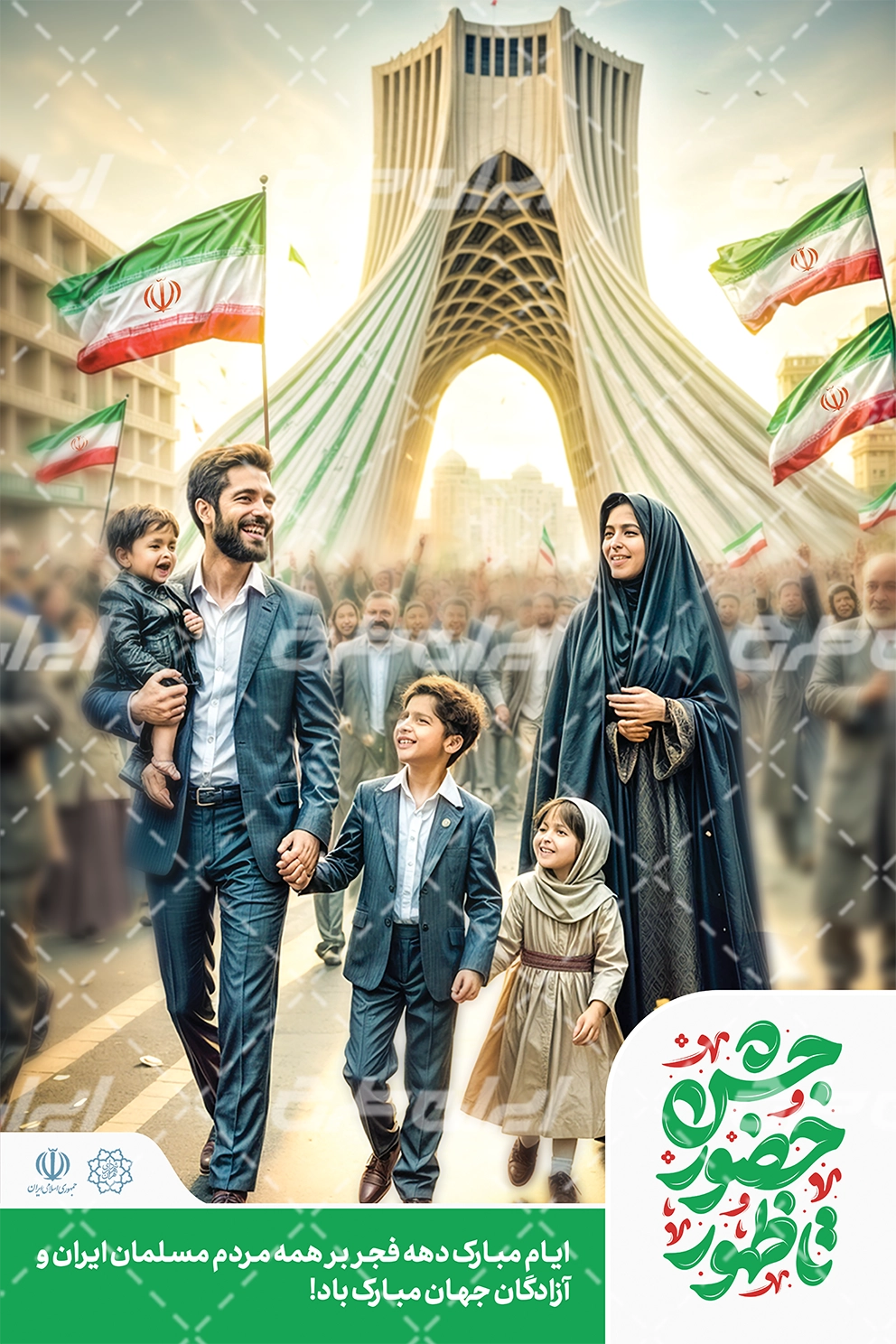 تصویر میدان آزادی، تایپوگرافی جشن حضور تا ظهور و متن گرامیداشت دهه فجر می باشد که توسط تیم ایران طرح طراحی شده است.