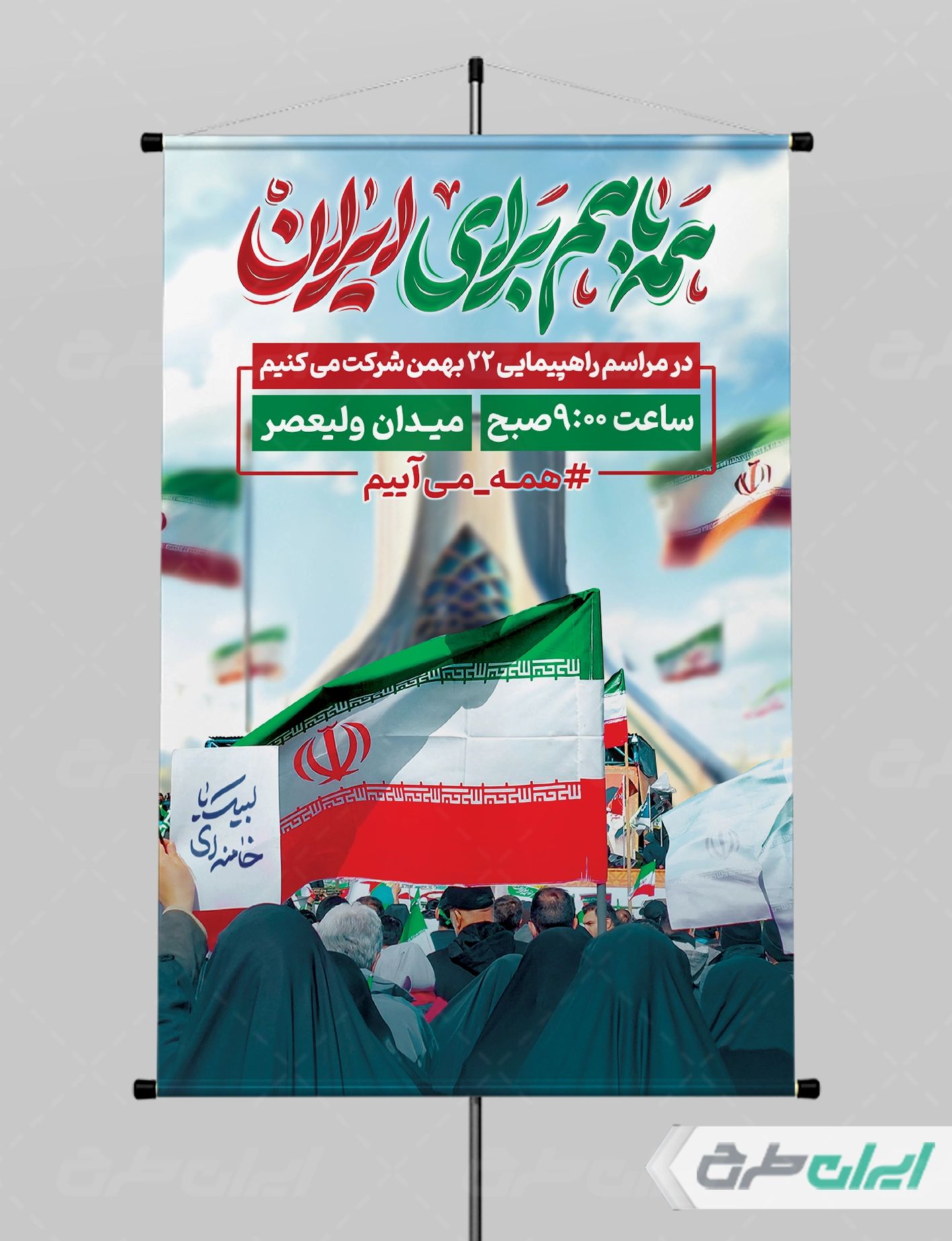 - طراحی بنر با استفاده از پرچم ایران و تایپوگرافی همه با هم برای ایران در طرح بنر دهه فجر