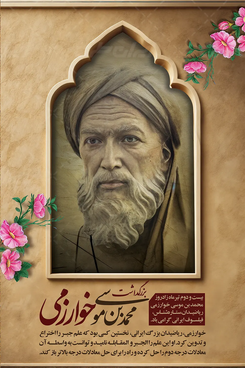 تصویر خوارزمی و متن گرامیداشت روز بزرگداشت خوارزمی می باشد که توسط تیم ایران طرح طراحی شده است.