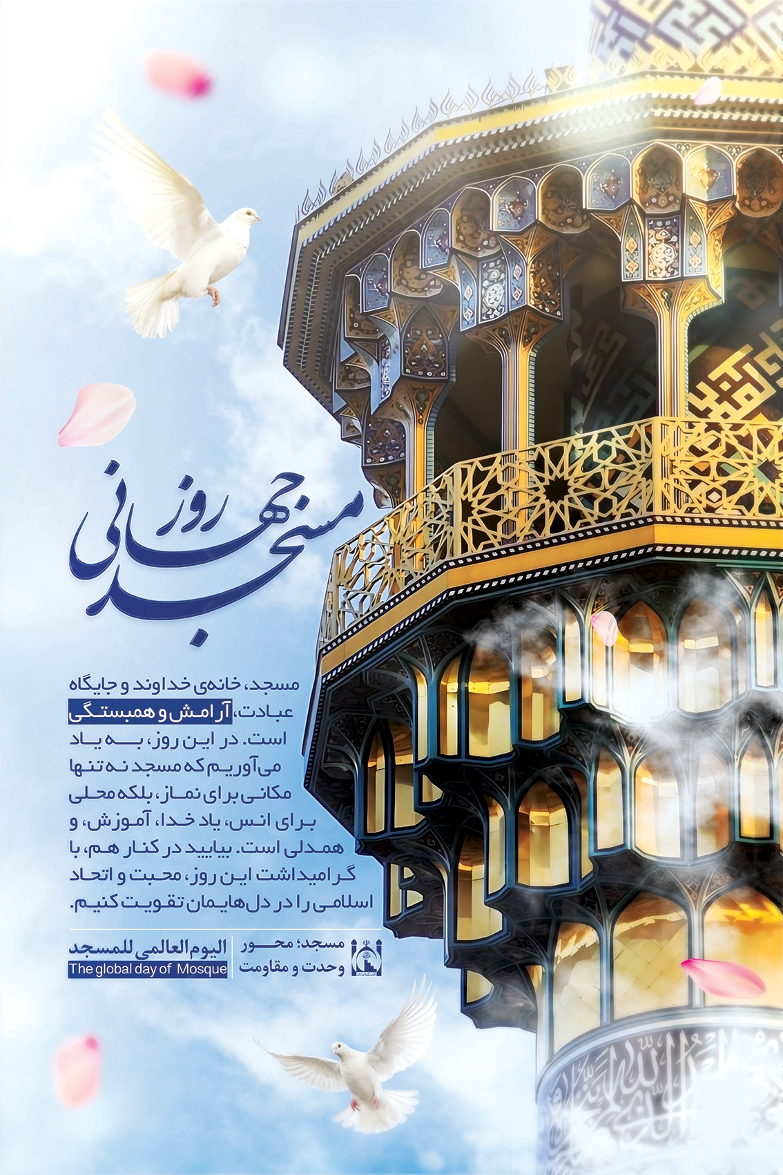 تصویر مسجد و متن گرامیداشت روز جهانی مسجد می باشد که توسط طراحان ایران طرح در نرم افزار فتوشاپ طراحی شده است.