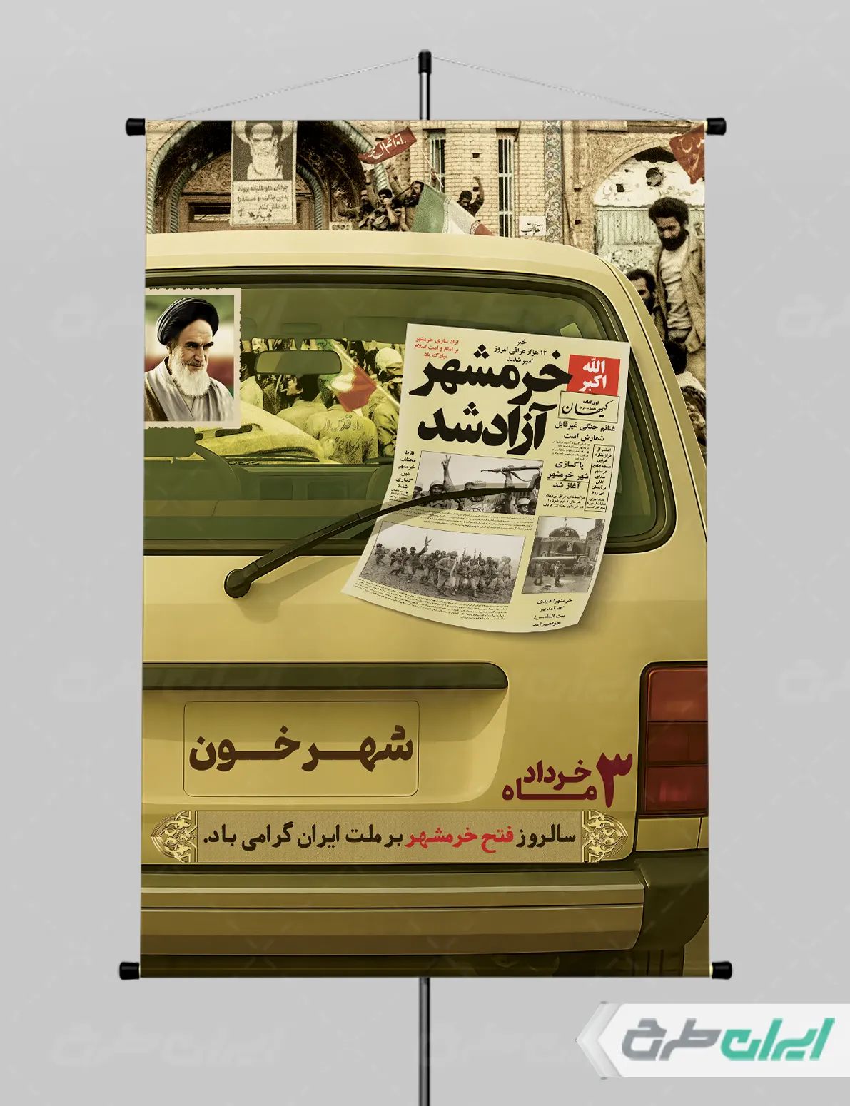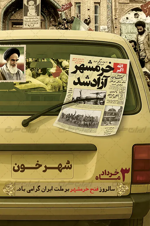 تصویر امام خمینی (ره) و متن گرامیداشت روز خرمشهر می باشد که توسط تیم ایران طرح طراحی شده است.