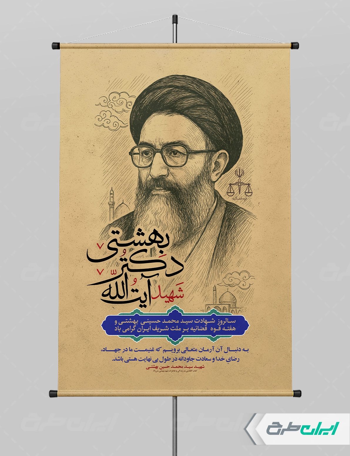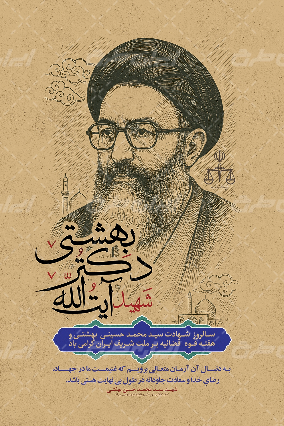 تصویر شهید بهشتی و متن مرتبط با روز قوه قضائیه و شهادت دکتر بهشتی می باشد که توسط تیم ایران طرح طراحی شده است.