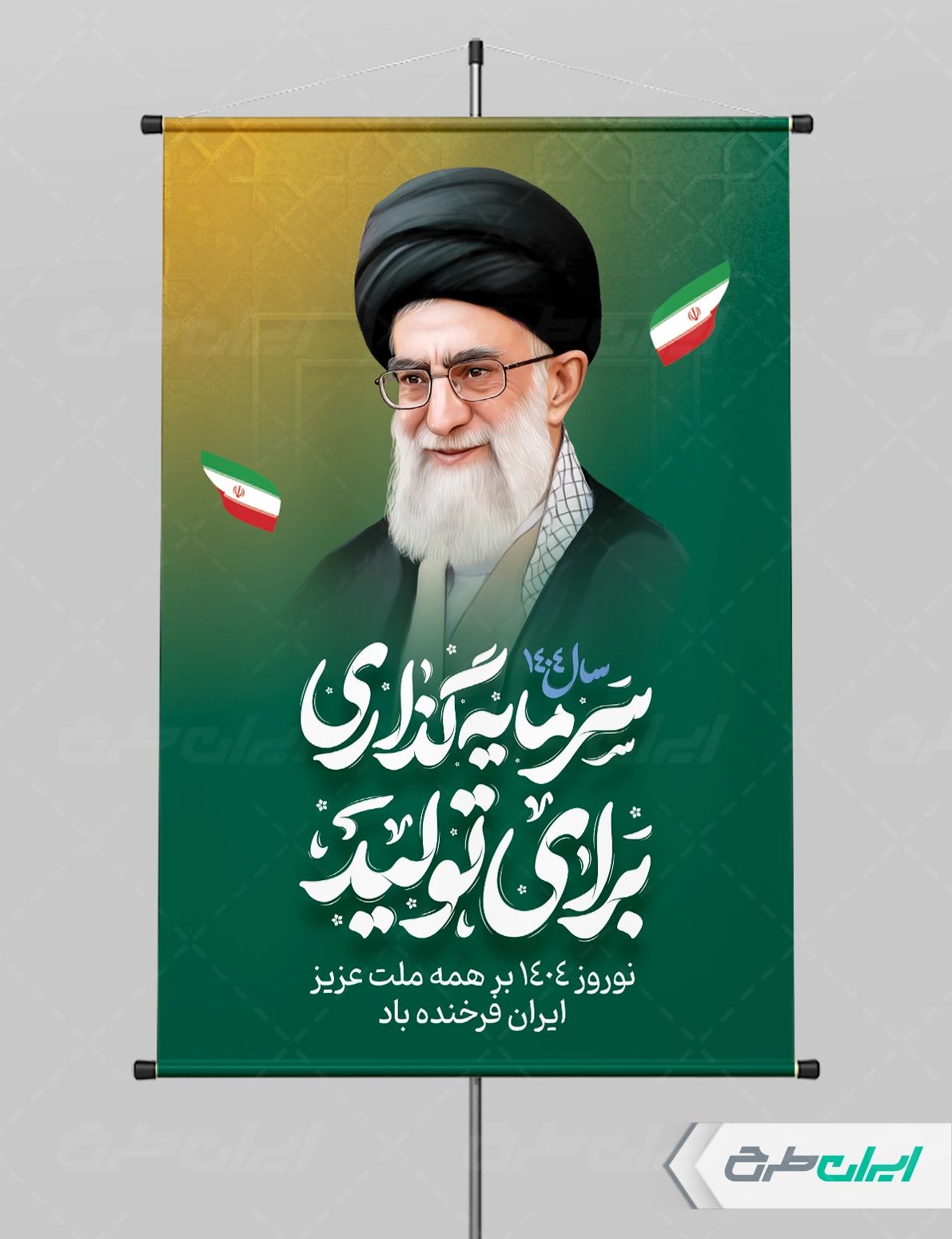 تصویر رهبری و متن شعار سال سرمایه گذاری برای تولید، که توسط تیم ایران طرح طراحی شده است.