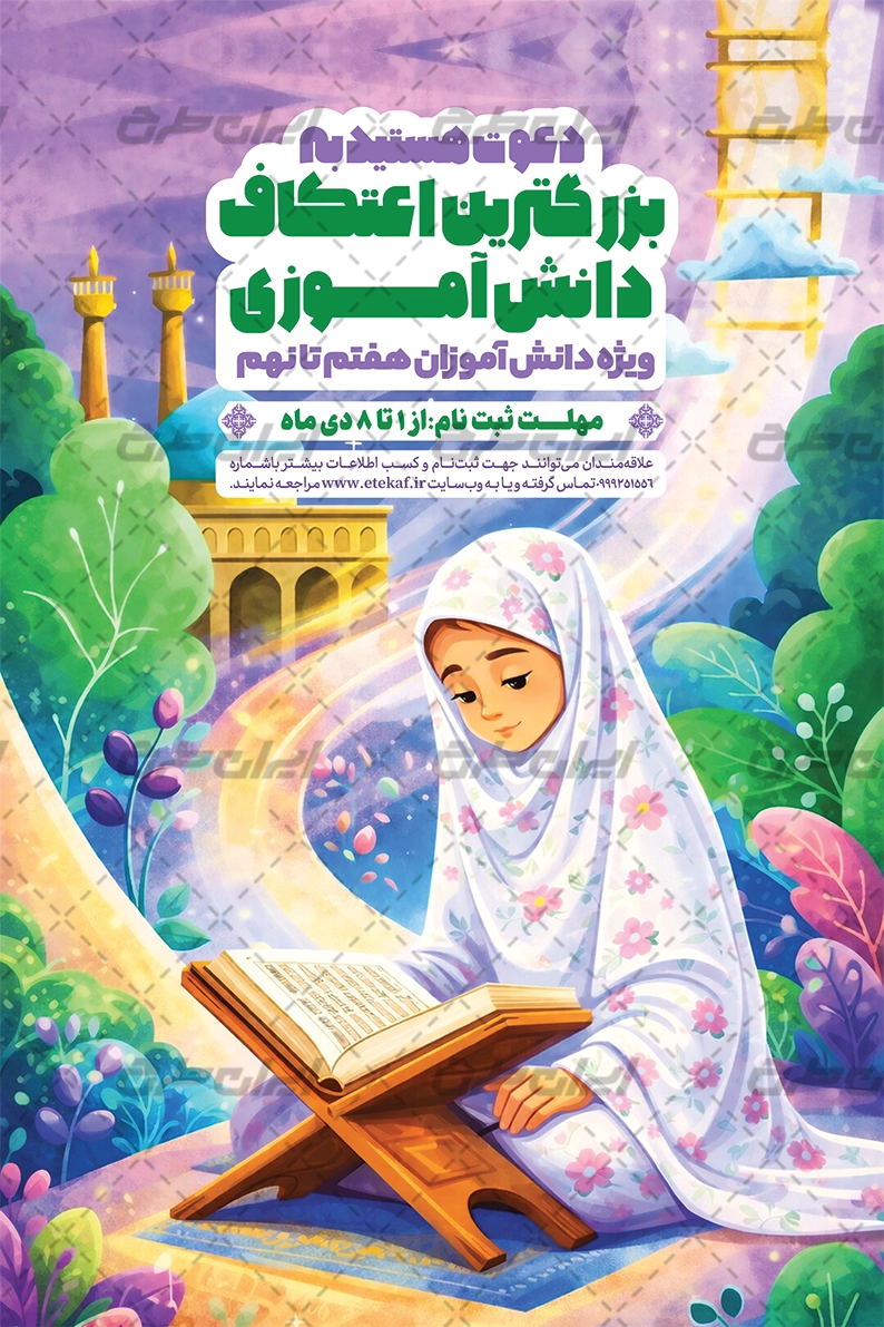 تصویر دانش آموز و متن مرتبط با بنر اطلاع رسانی مراسم اعتکاف می باشد که توسط تیم ایران طرح طراحی شده است.