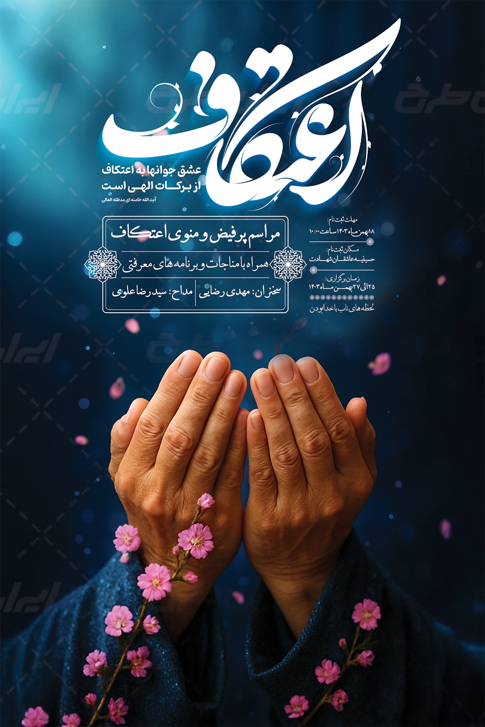 تصویر دعا کردن و متن مرتبط با بنر اطلاع رسانی مراسم اعتکاف می باشد که توسط تیم ایران طرح طراحی شده است.
